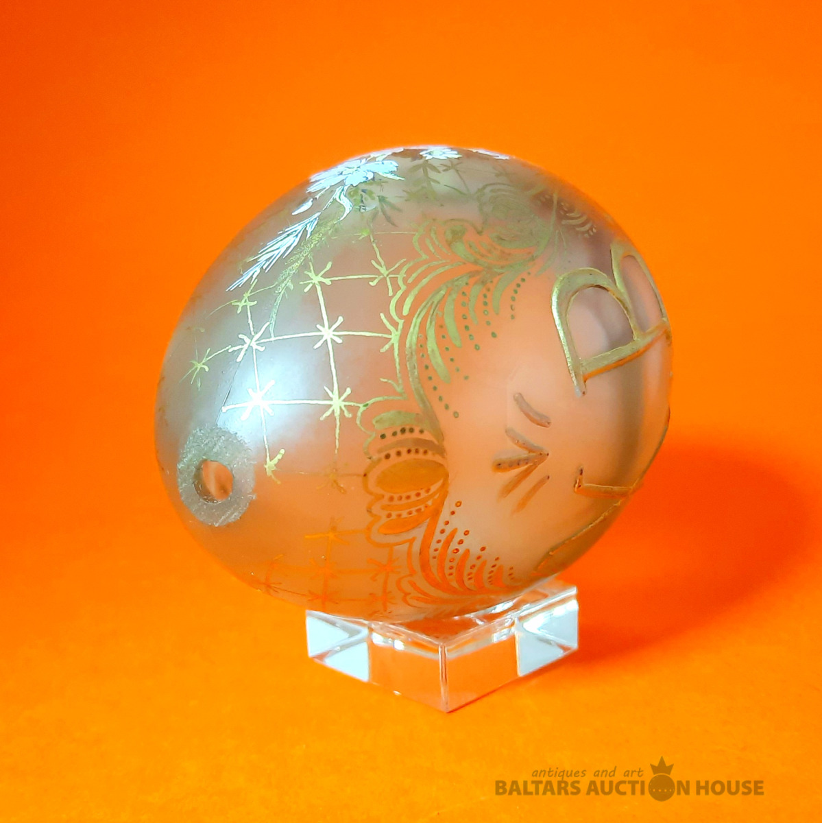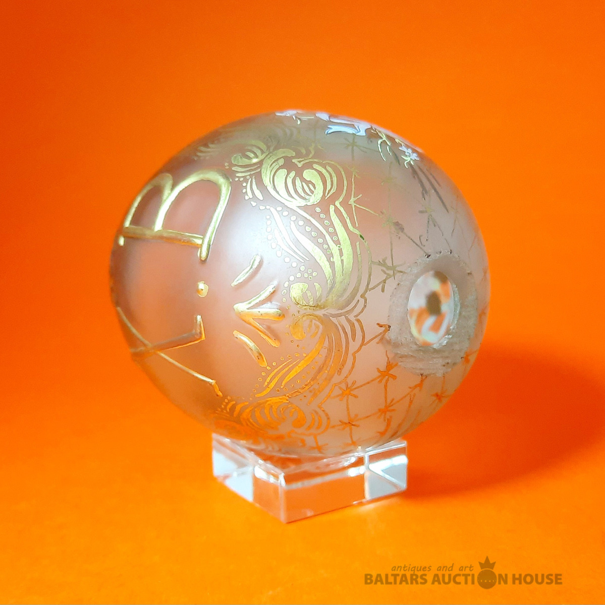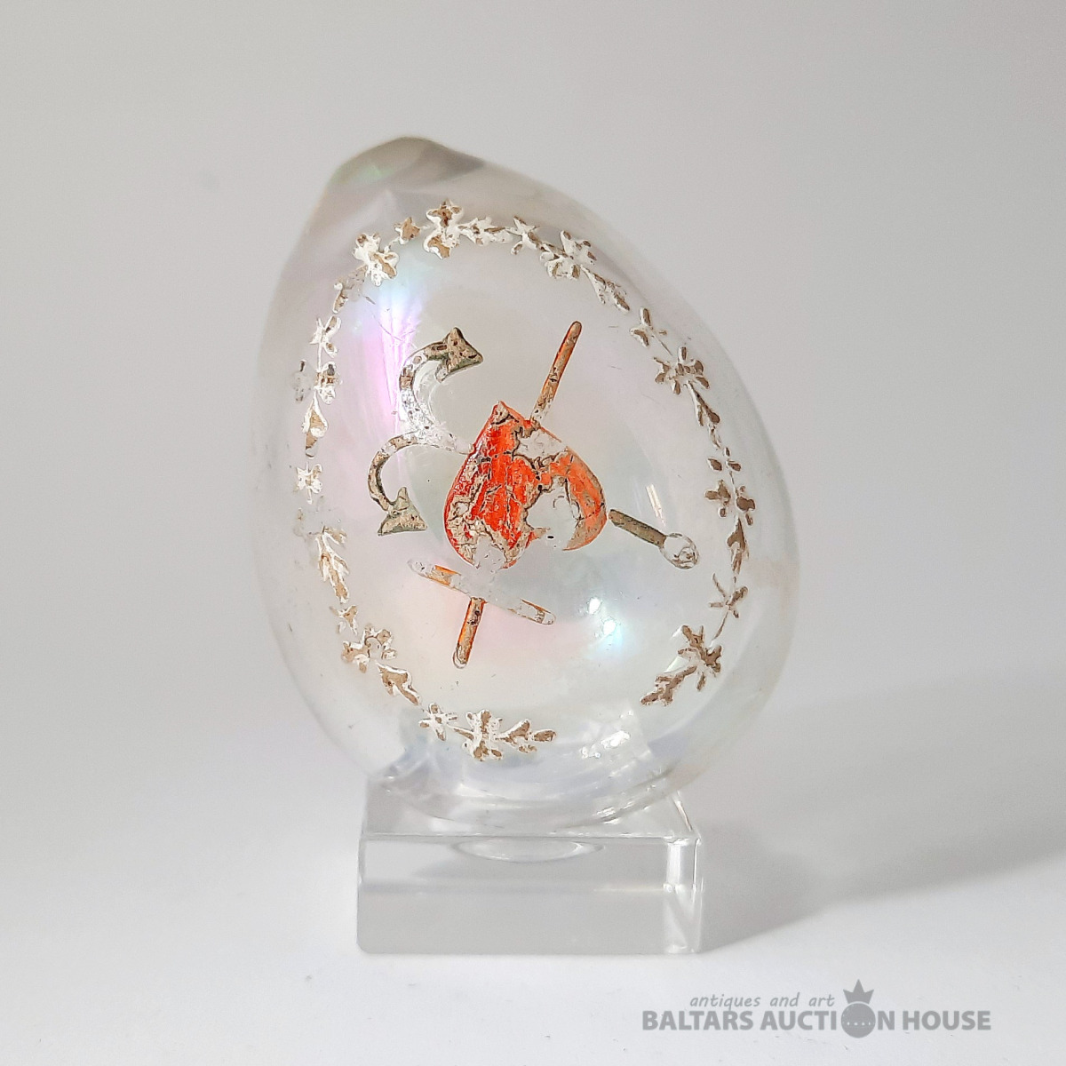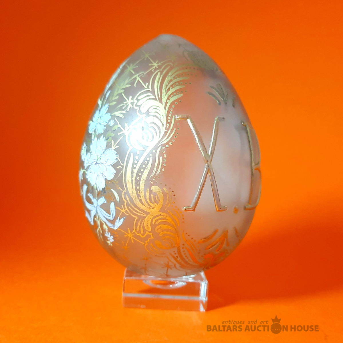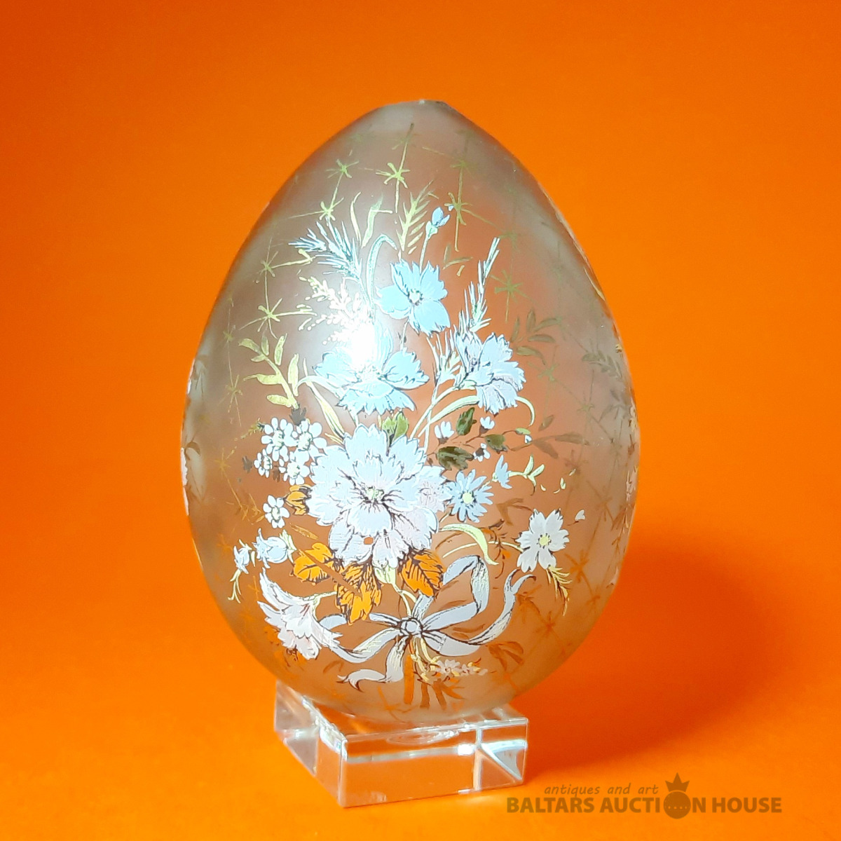 Stikla Lieldienu ola ar ziedu gleznojumu. Valsts: Cariskā Krievija. Vecums: 1890–1910. Izmērs (cm): Augstums 9 cm. Materiāls: Stikls. Stāvoklis: Lieli, Statīvs nav pārdošanā!!!!!