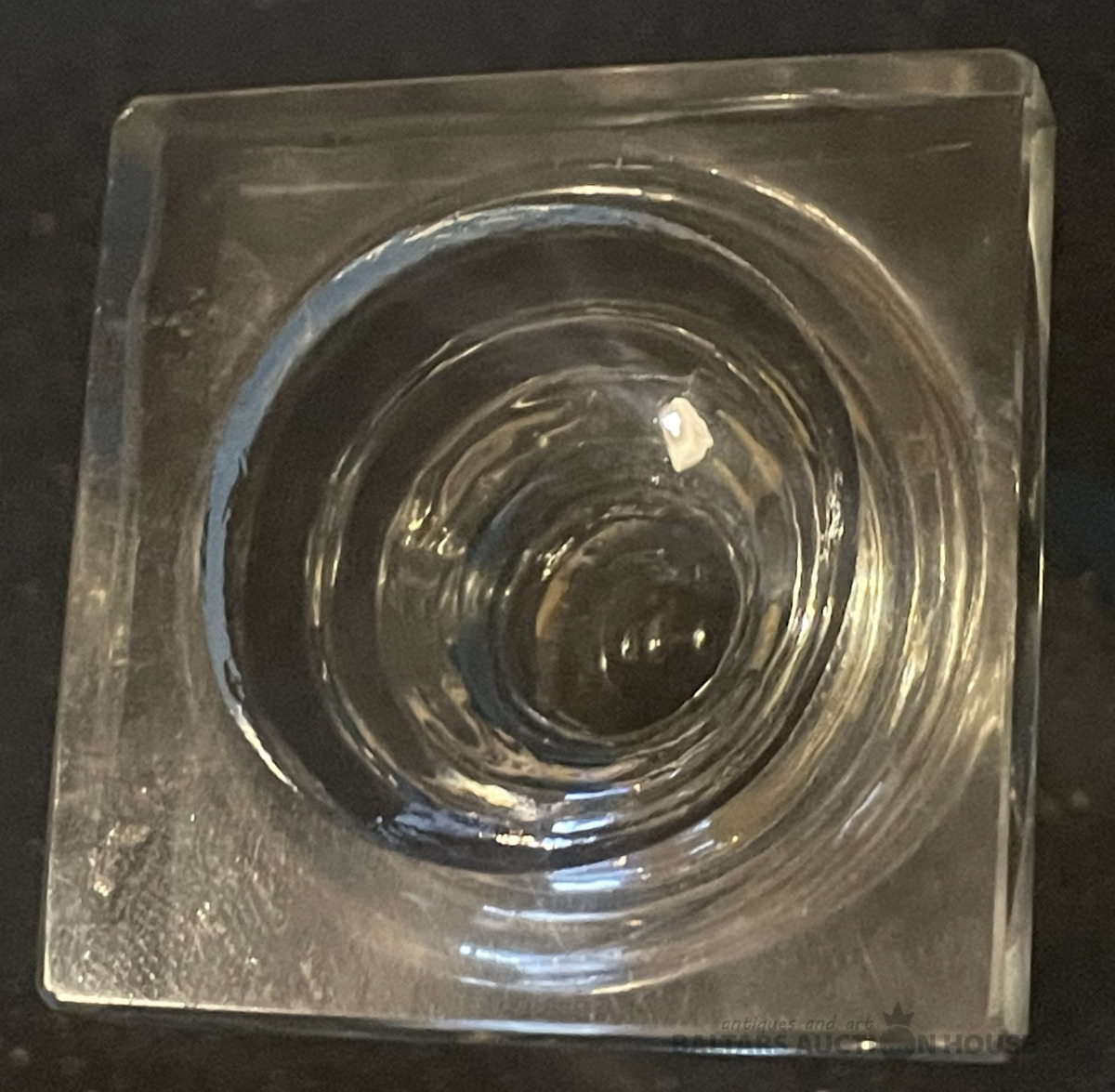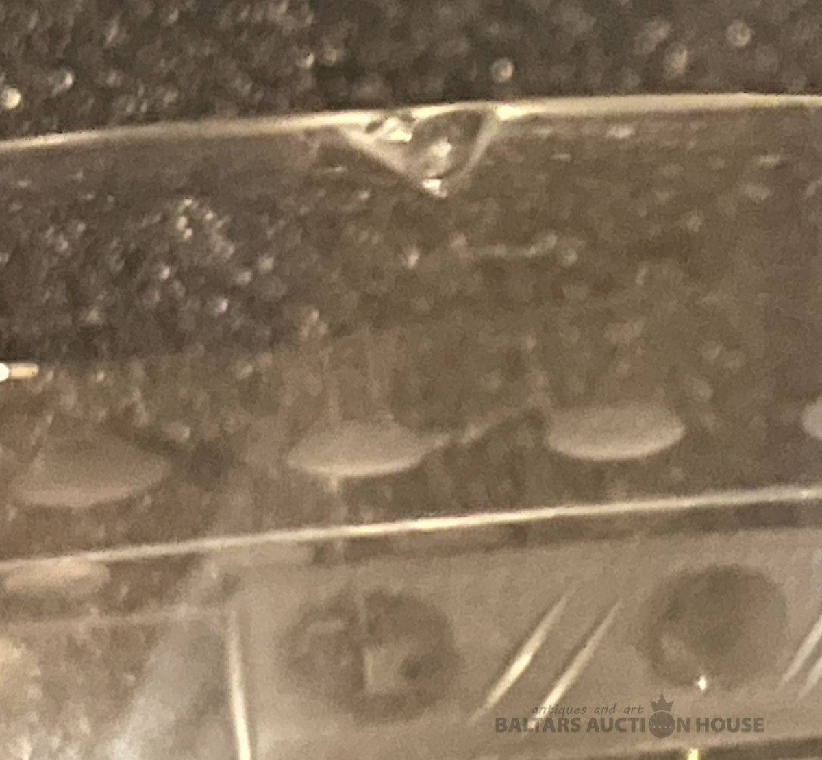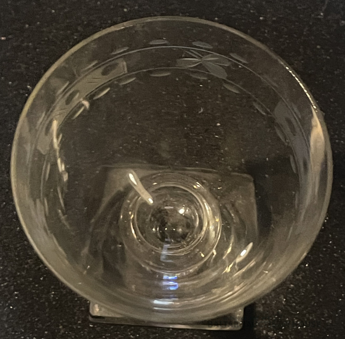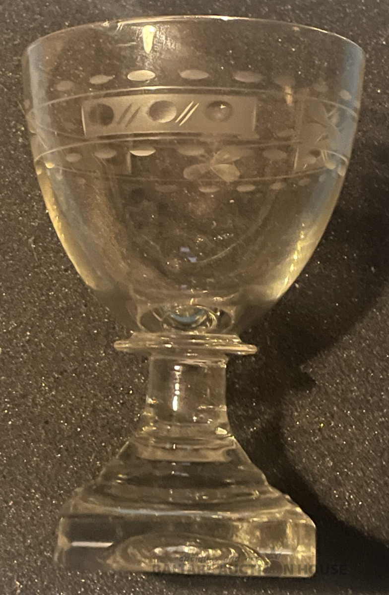 Glāze, stikls, gravējums, h=10,2 cm, ap 1880.gadu, palielinājumā var saaskatīt nelielu robiņu malai