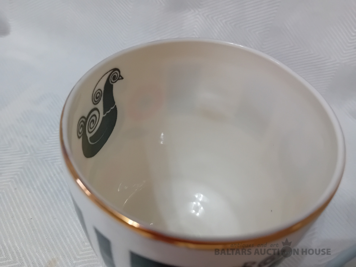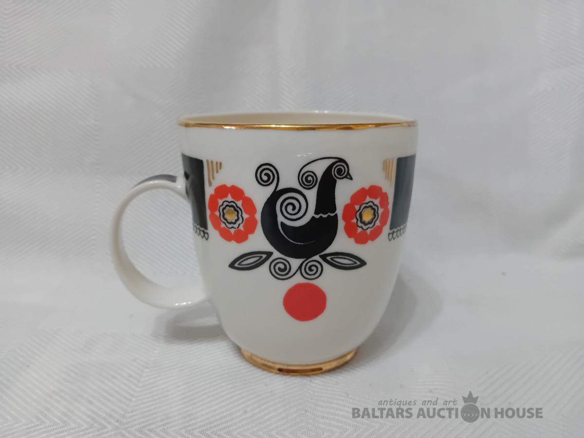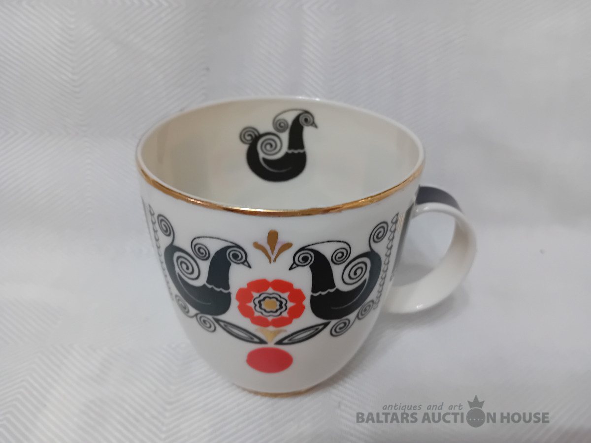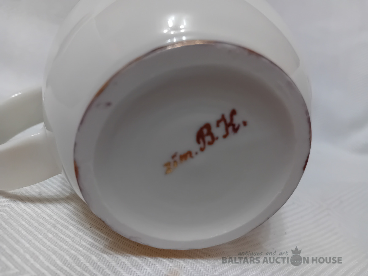 Liela,plānsiena krūze, B.Kārkliņas paraksts, Tilpums 420 ml,glazūras notecējums, sabiezējums uz krūzes malas,osa iespiesta dziļāk krūzes masā, iekšpusē izveidojies izcilnis-lidz ar to, kruzei ir dobja skaņa.Plaisu nav!