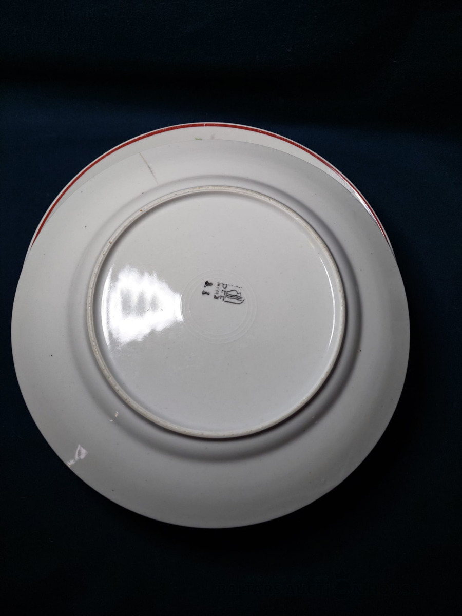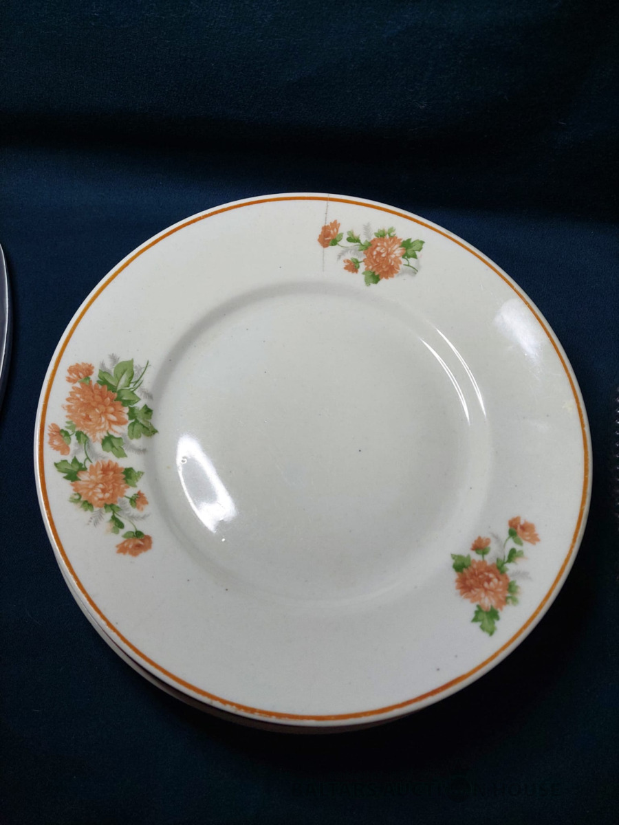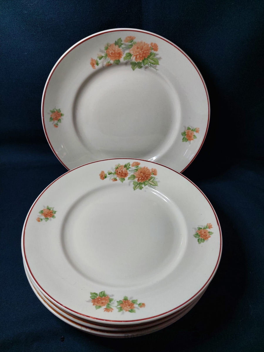 Pieci servēšanas šķīvji ar krizantēmām 1940-50.gadi., Vienam šķīvim ir plaisa ,redzama attēlā.