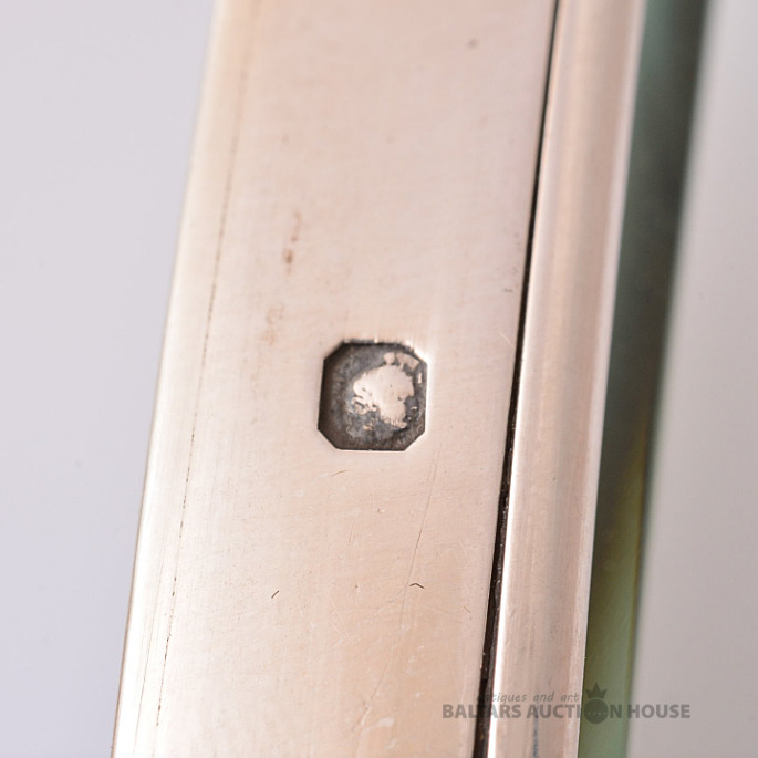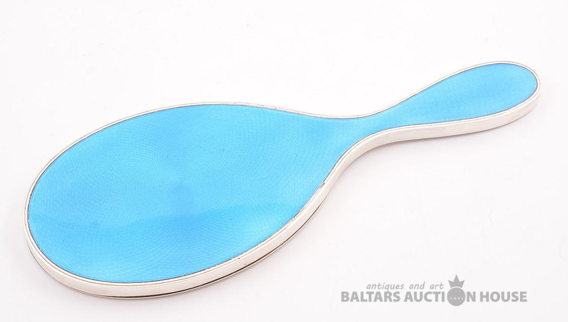 Rokas spogulis, sudrabs, spilgti zila giljošas emalja, 950 proves vērtība, izstrādājuma kopējais svars 367,95, emalja, 25,6 x 9,8 cm, 20. gadsimts, Francija.