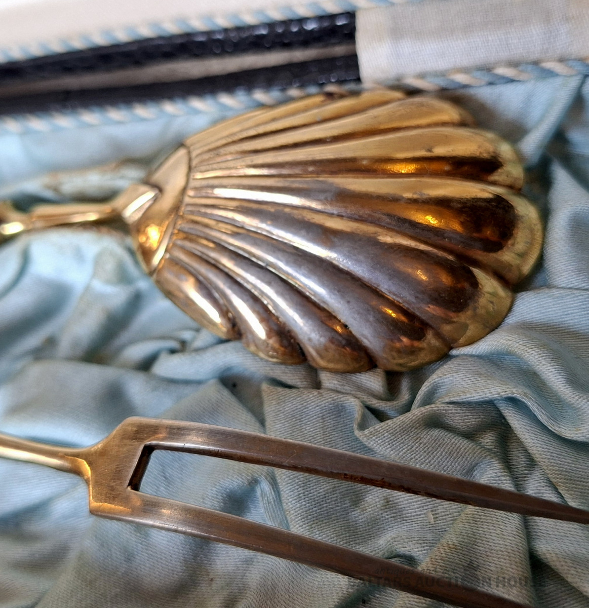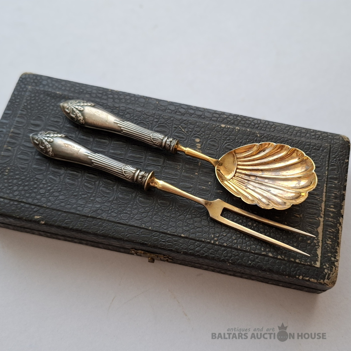 Galda piederumu komplekts. 875. proves sudraba rokturi ar apzeltījumu (neliels nolietojums). Komplektā ietilpst karote un dakšiņa oriģinālajā kastītē. Latvija, 1930. gadi. Kopējais svars: 54,34 grami. Karotes garums: 16 cm. Dakšiņas garums: 17,5 cm. Оставить отзыв Google Переводчик