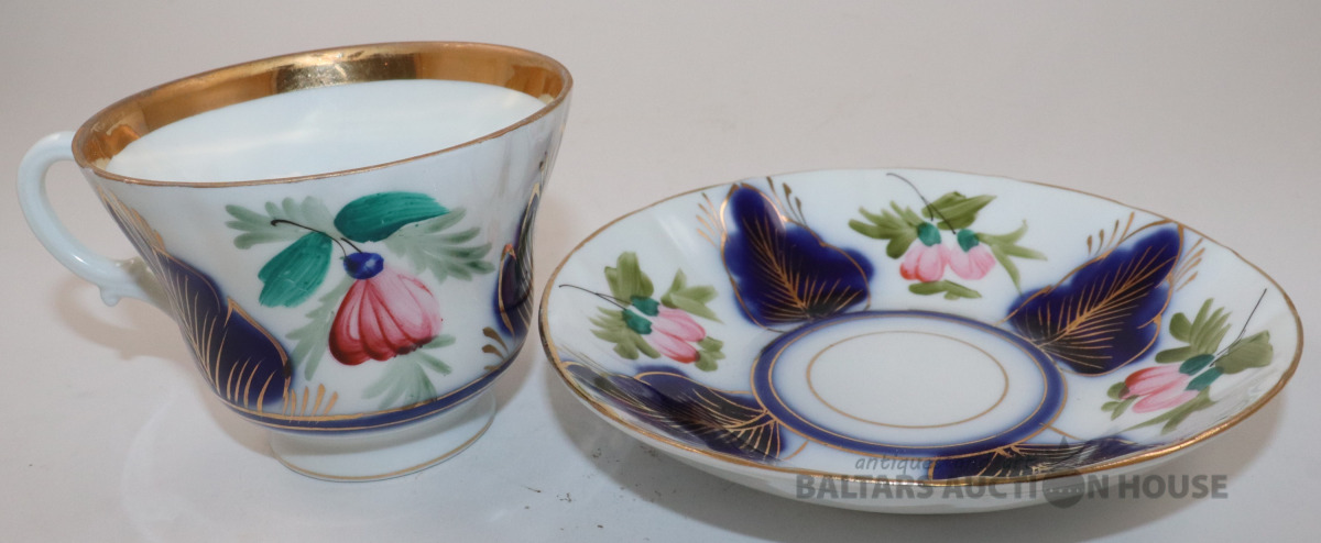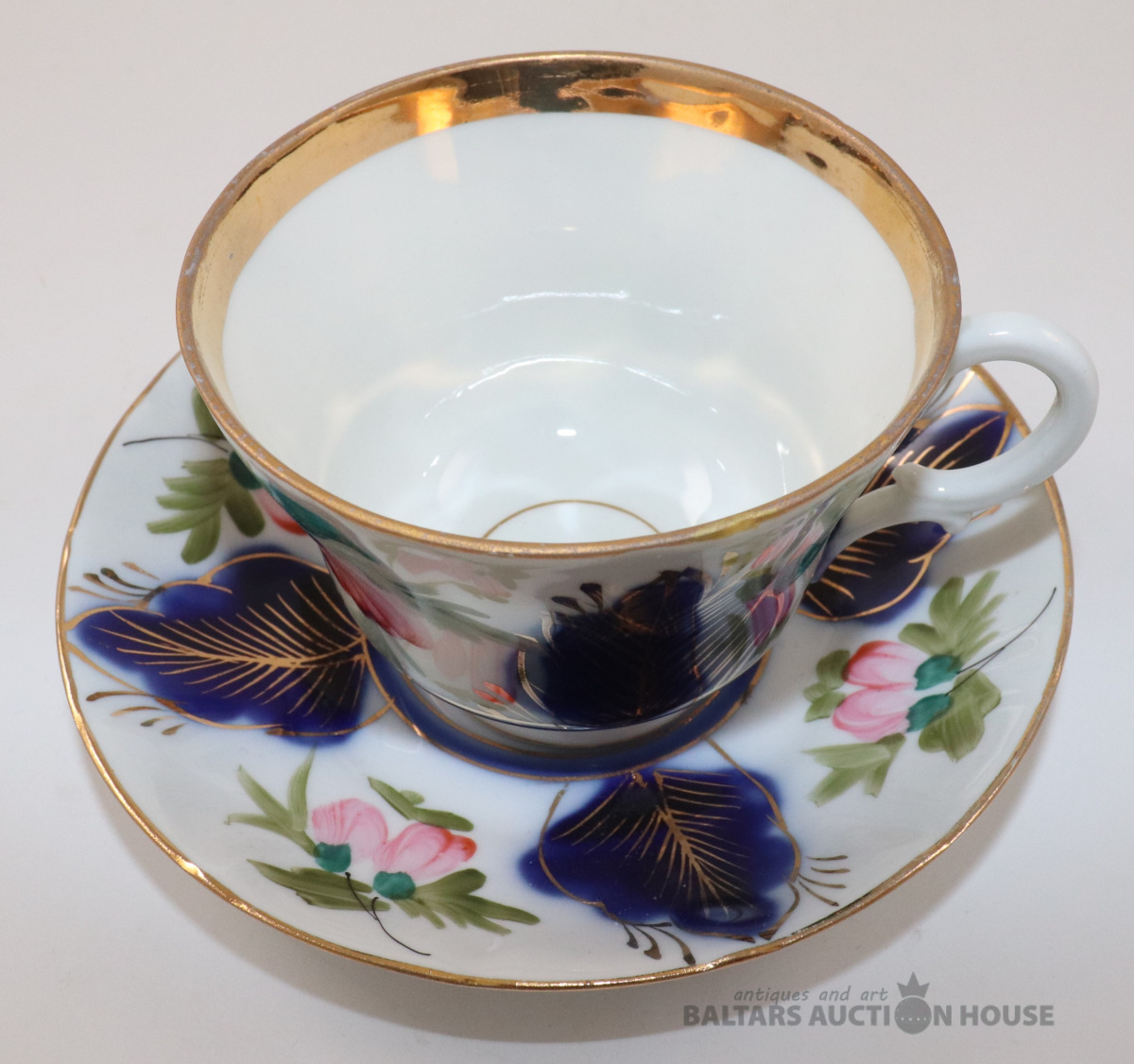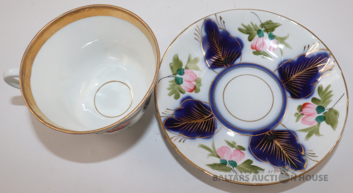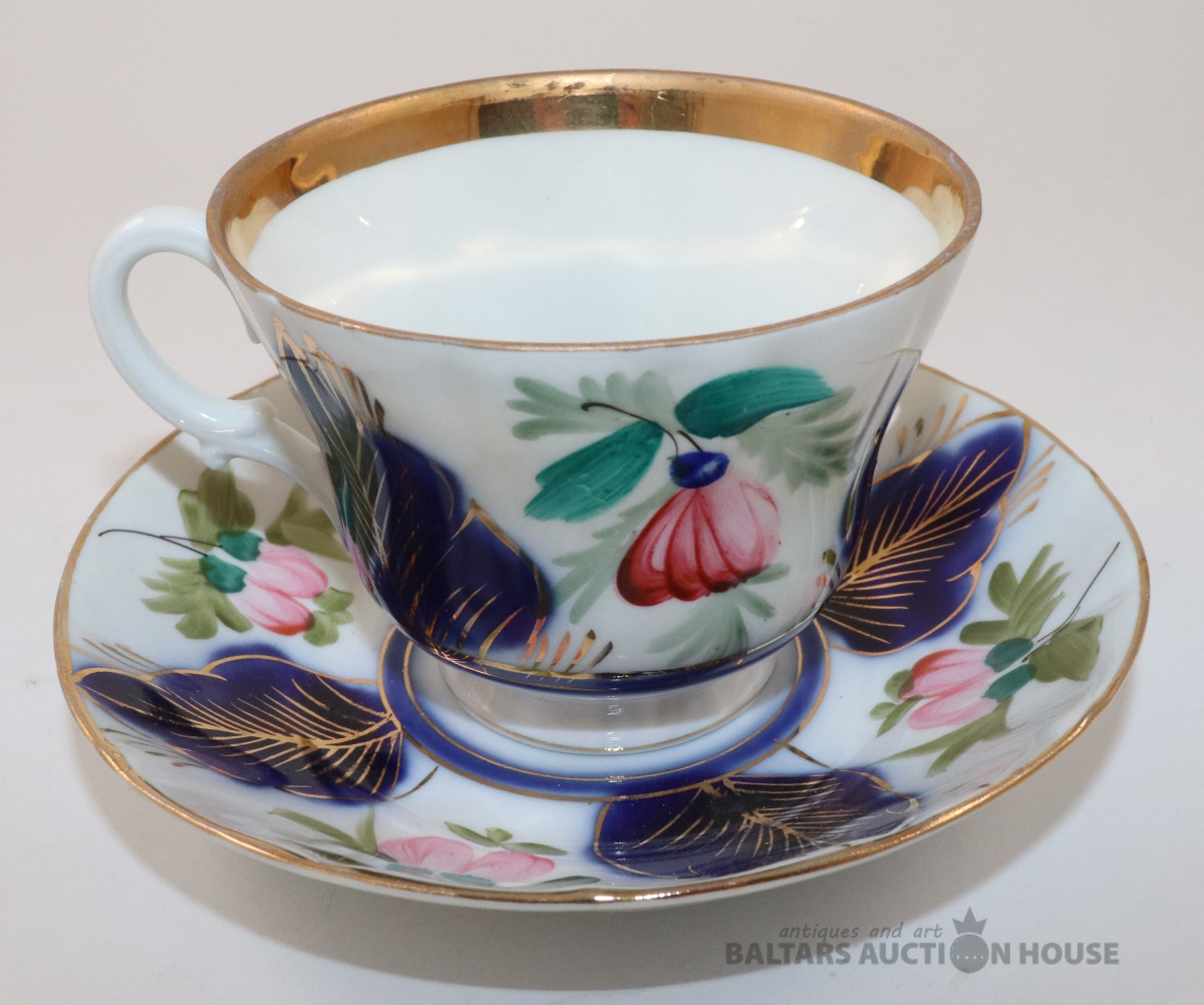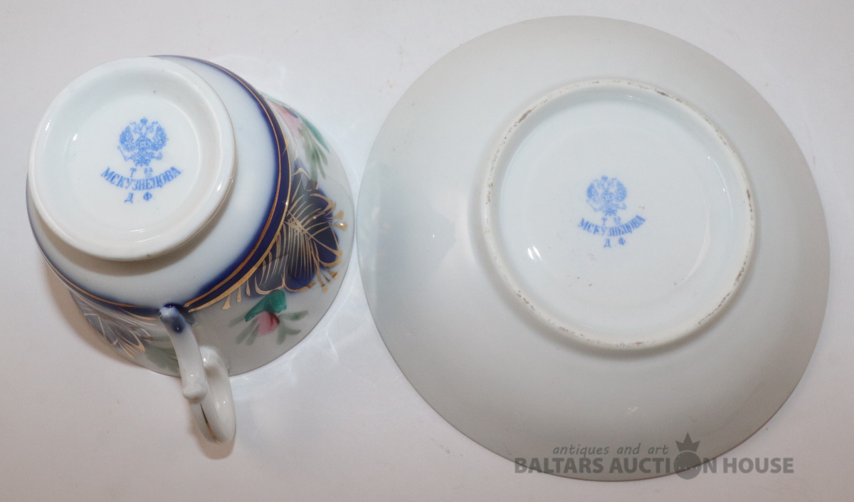 Tase un apakštase ar kobalta zilu krāsojumu un zeltījumu. Roku apgleznojums. Kuzņecovs. h=7,5 cm. d=9,5 un 15 cm.