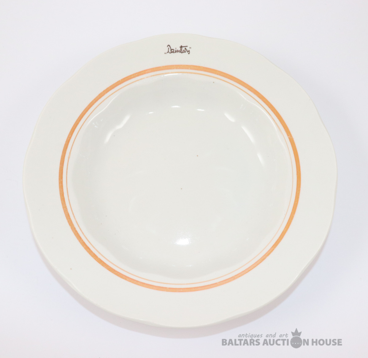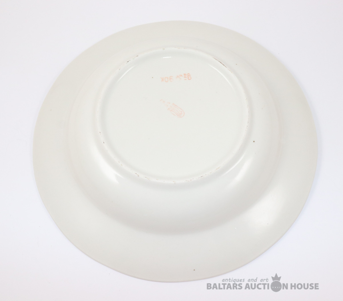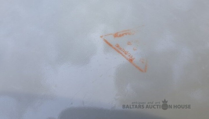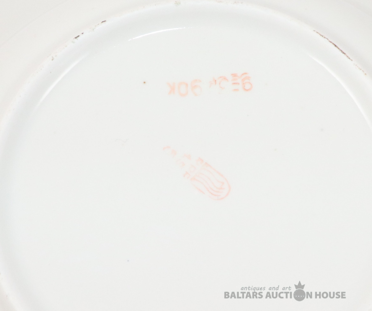 Šķīvis ar reti sastopamu zīmogu, trīsstūris un uzraksti tajā iekšā Нарком Мостпром Латв СССР Р.Ф.З. Porcelāns, RPF. d=24,5 cm
