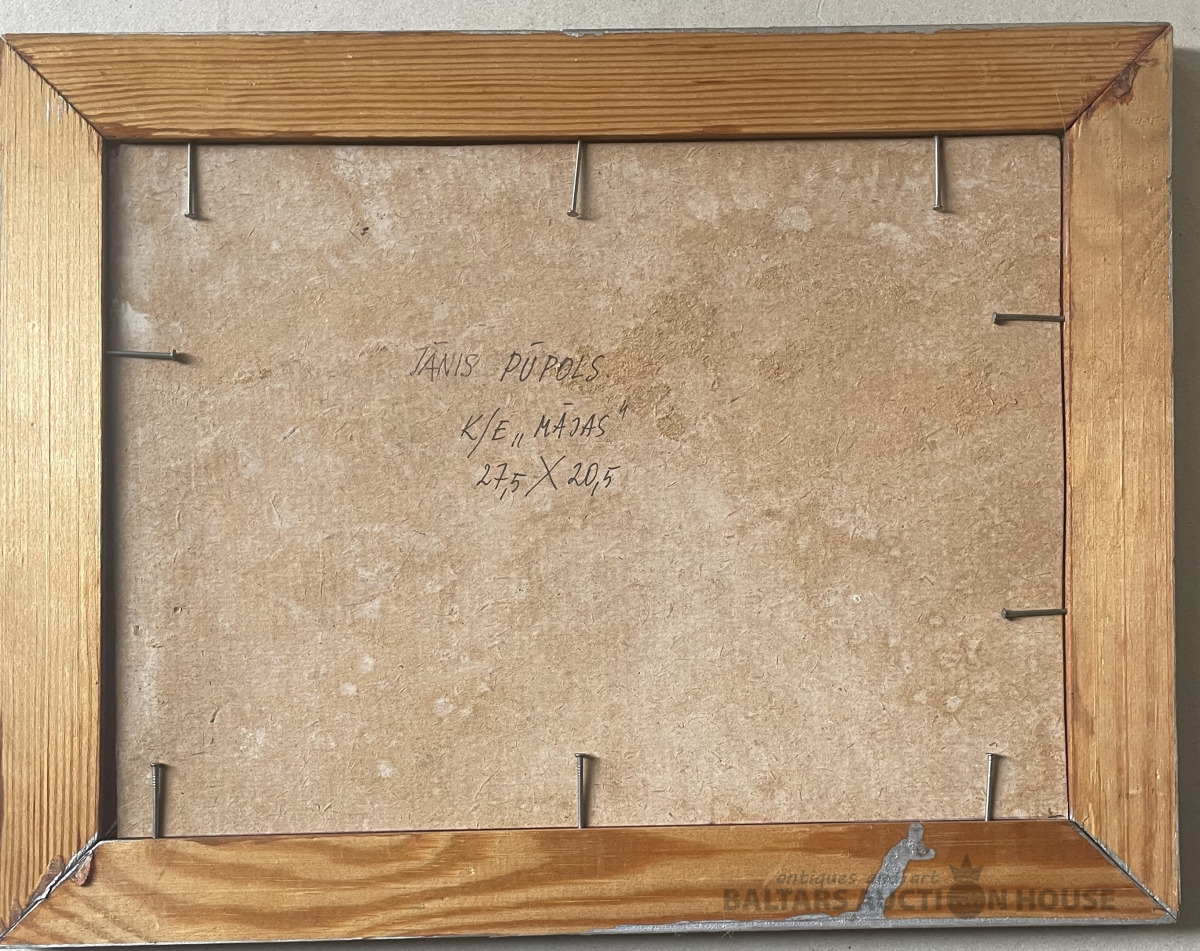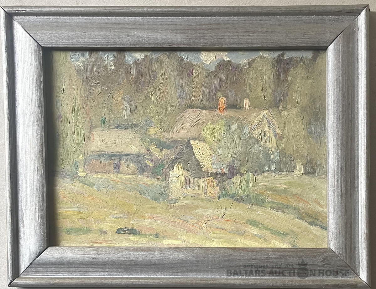 Jānis Pūpols 1886.-1956. LAUKU MĀJAS PIE MEŽA, k.e., 19,6x27cm, ap 1940.g.