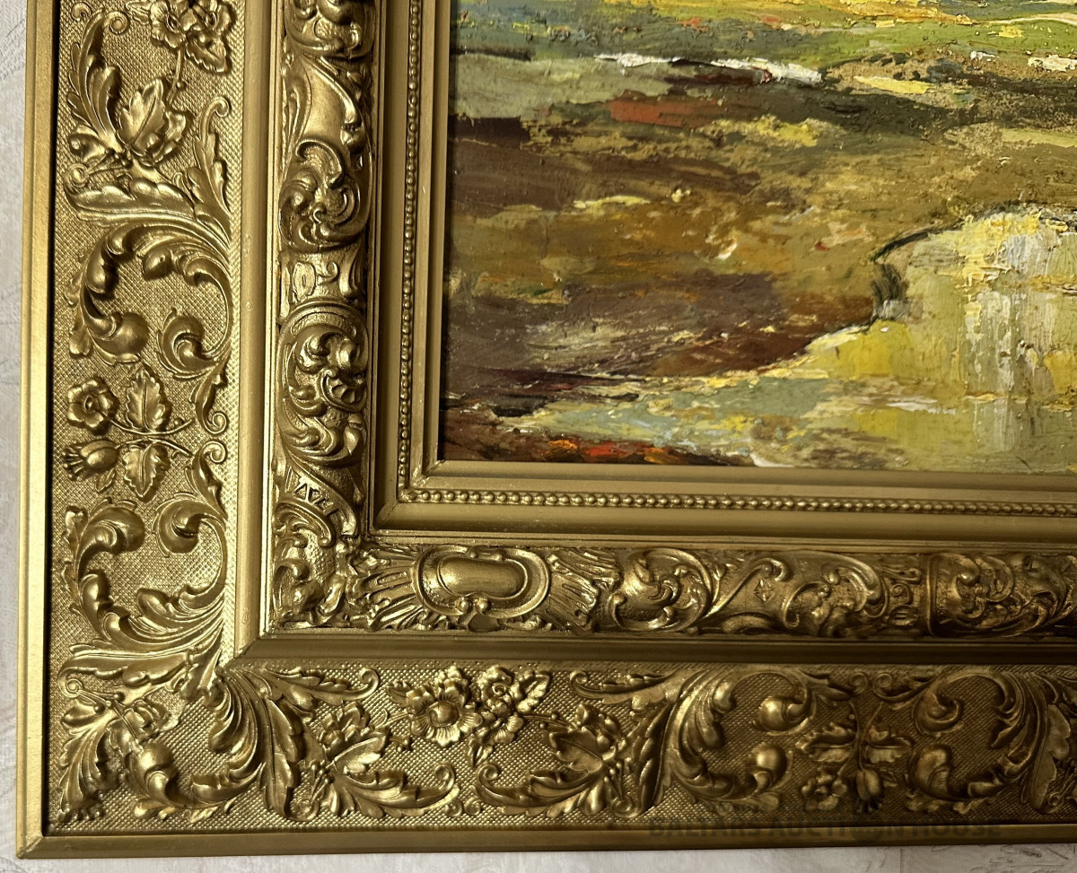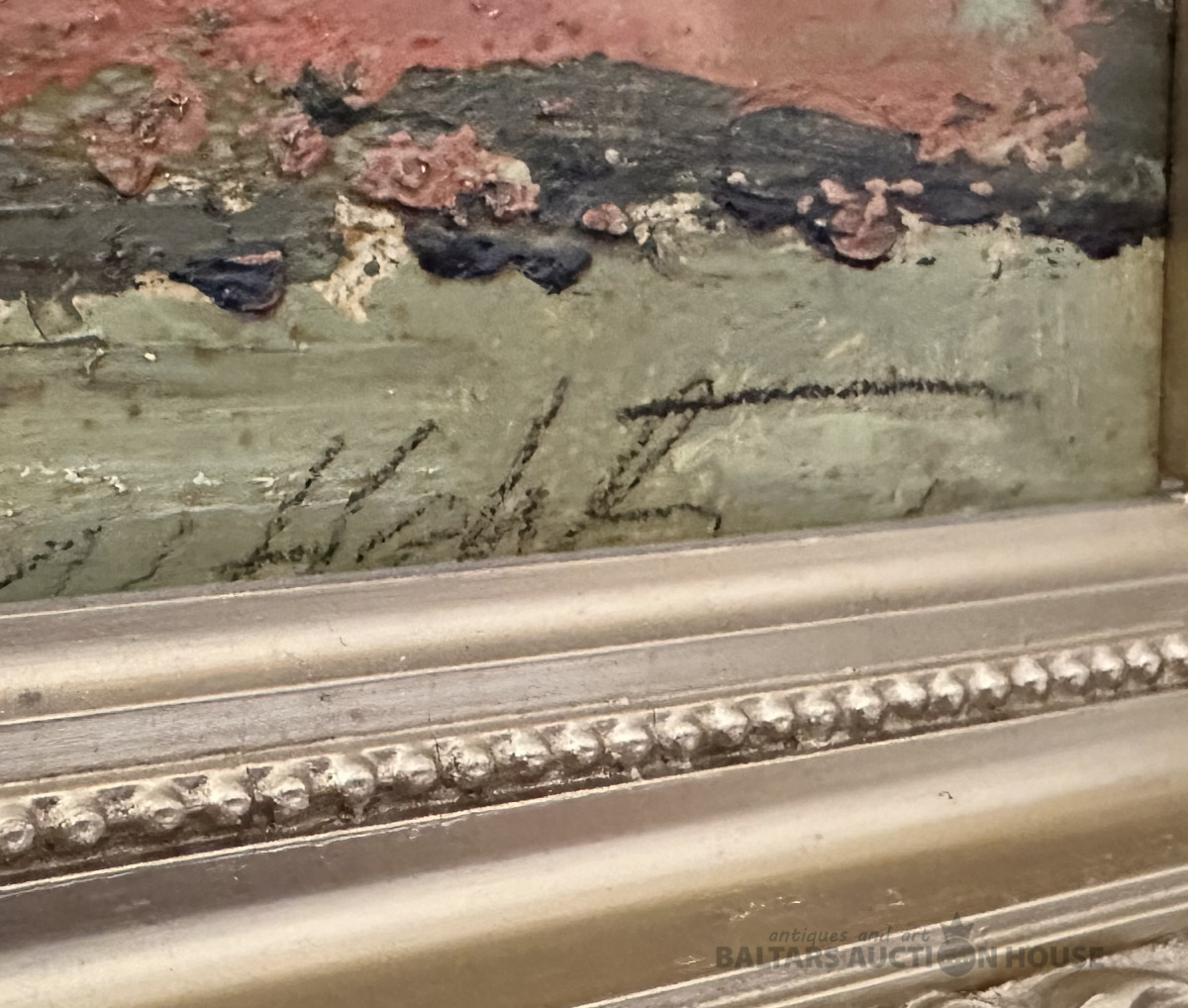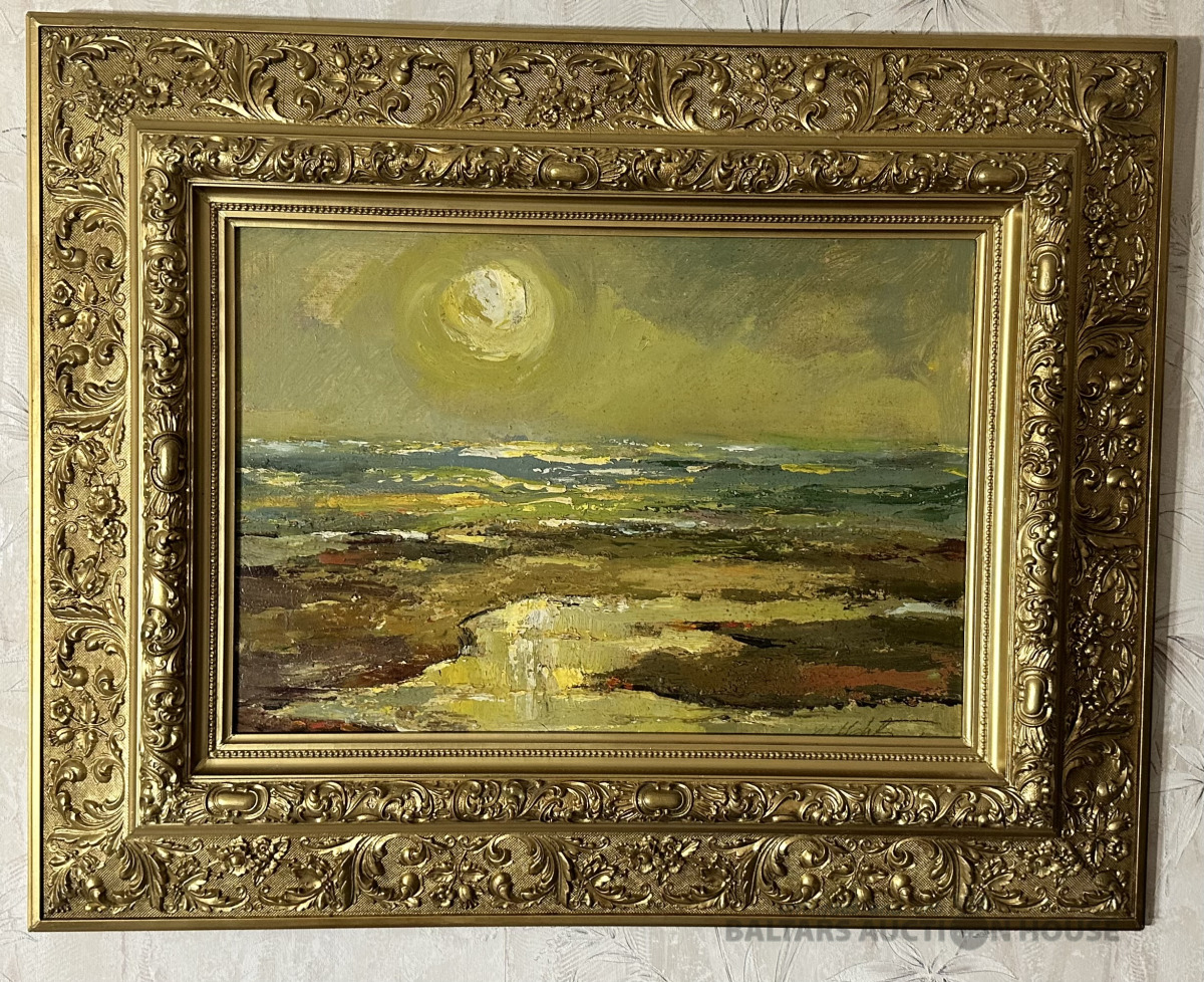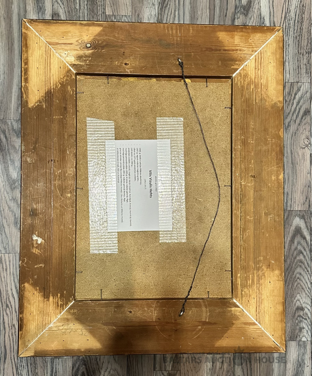 PLUDMALES TVEICĒ, eļļa, kartons, 20.gds. vidus ekspresionisma stilā gleznota jūras ainava, 19.gds. beigu oriģināls neobaroka rāmis. Mākslinieks Vilis Vizulis Hehts (1952-2017), beidzis Latvijas mākslas akadēmiju, maģistrs, LMS biedrs, piedalījies izstādēs Lietuvā, Ungārijā, Vācijā, Zviedrijā, Norvēģijā, Krievijā, Austrālijā, Kanādā sākot no 1975.gada. Viņa gleznas atrodamas Latvijas nacionālajā mākslas muzejā, Cēsu vēstures un mākslas muzejā, privātkolekcijās ASV, Austrālijā un Eiropā. Gleznas lielums bez rāmja 28x40 cm. 19. gds. smags koka rāmis ar profilu 105x55 mm, skuju koks un gesso slānis, labi saglabājies rāmis, nedaudz restaurēts un līmēts stūros no jauna.