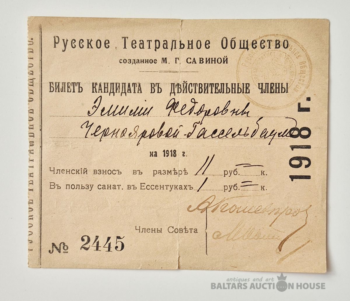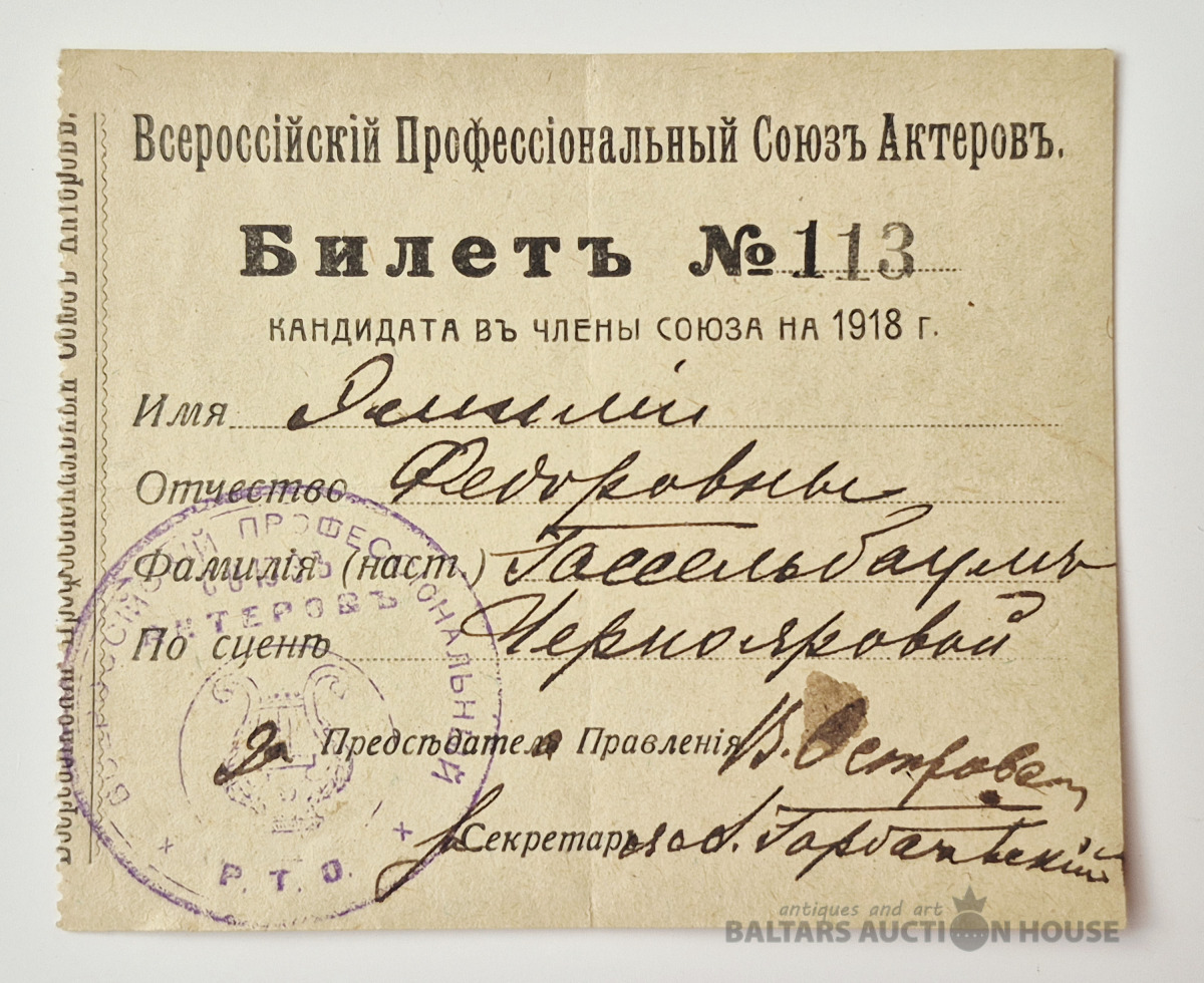 Билет в кандидата в члены союза на 1918 год. Всероссийский Профессиональный союз актёров.