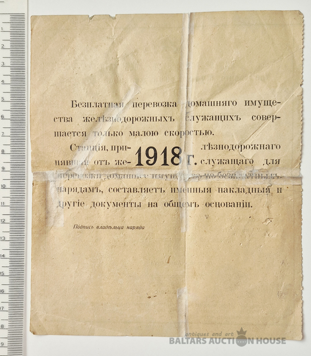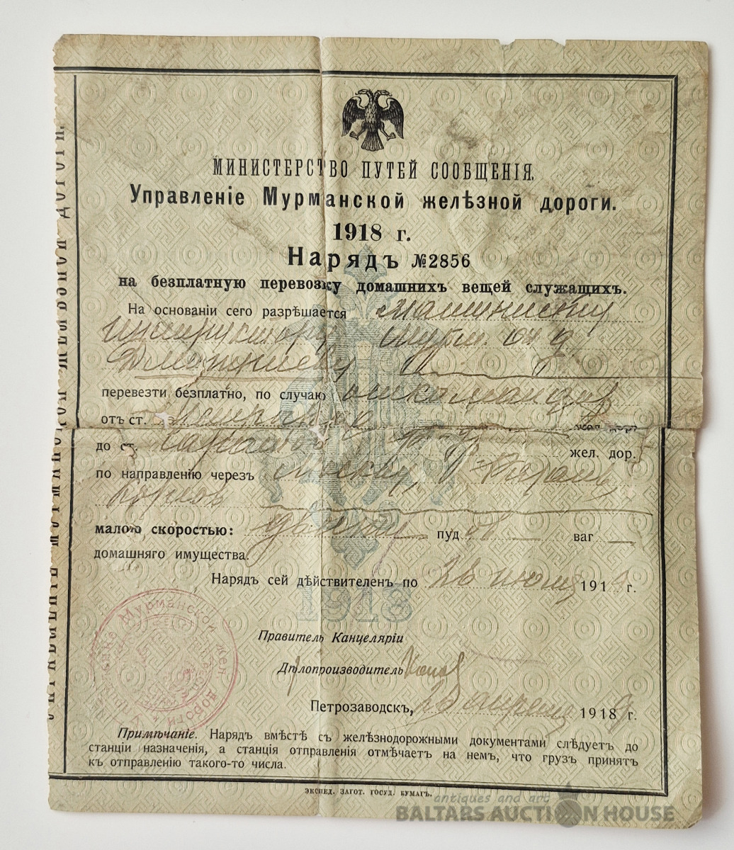 Наряд на бесплатную перевозку домашних вещей служащих. Мин.путей сообщения, 1918г.