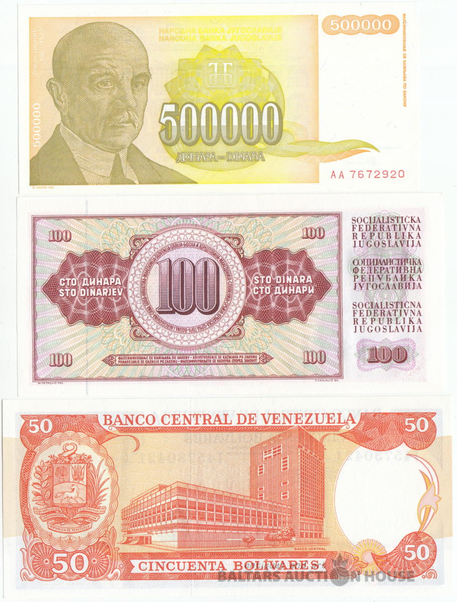 Banknotes, Jugoslavija/Yugoslavia 100 (1981) un 500000 dināri (1994), Venecuēla, 50 Bolivari 1995, UNC