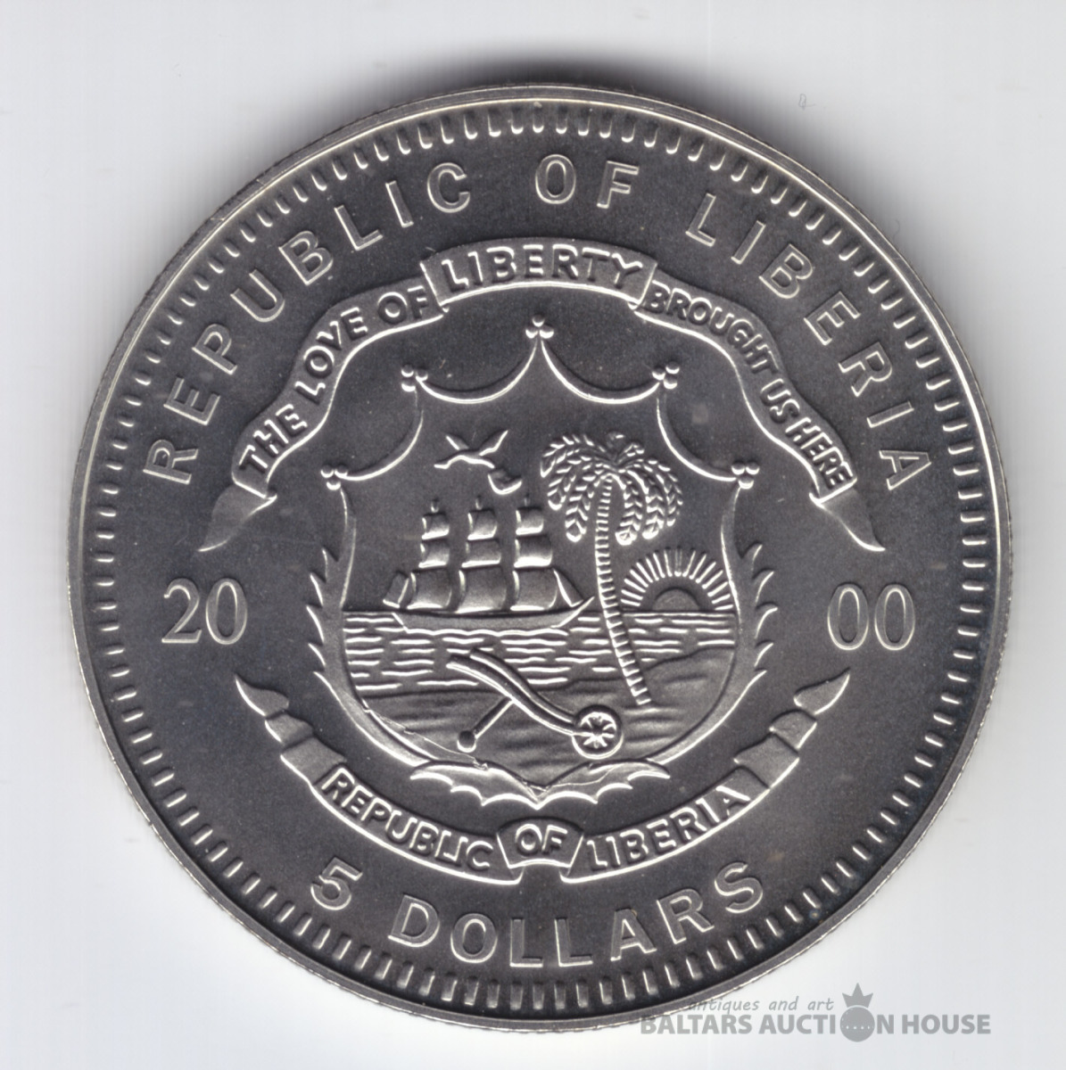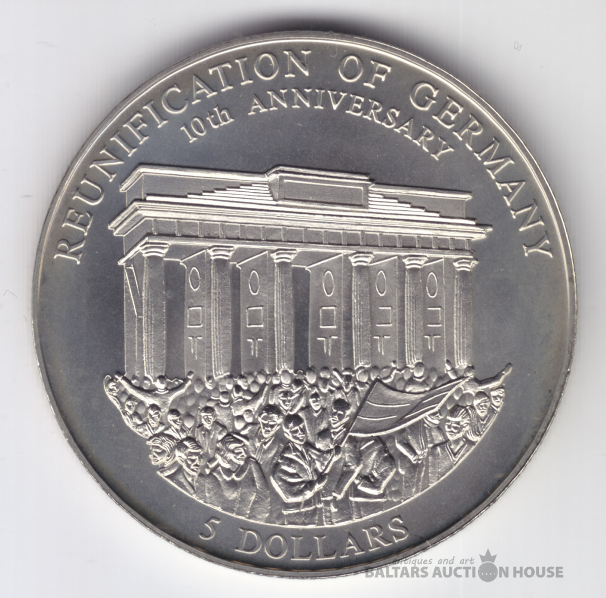 Piemiņas monēta, Libērija, 5 Dolāri 2000.g., "10 Vācijas vienotības gadi" , monēta kapsulā, Metāls: CuNiZn, Reljefa kvalitāte: BU, Diametrs: 40 mm, Svars: 32g Tirāža: maks. 20 000 eksemplāru