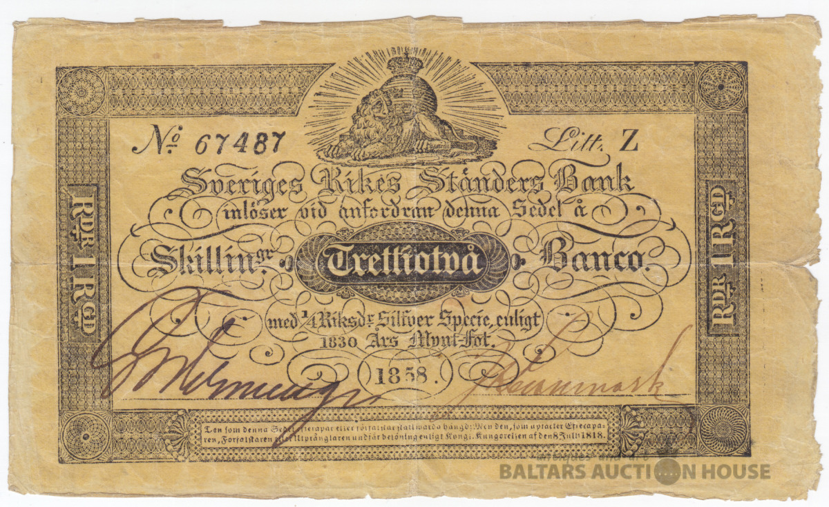 Banknote, Zviedrija/Sweden 32 Skillingar Banco, 1858, VF, Retums!