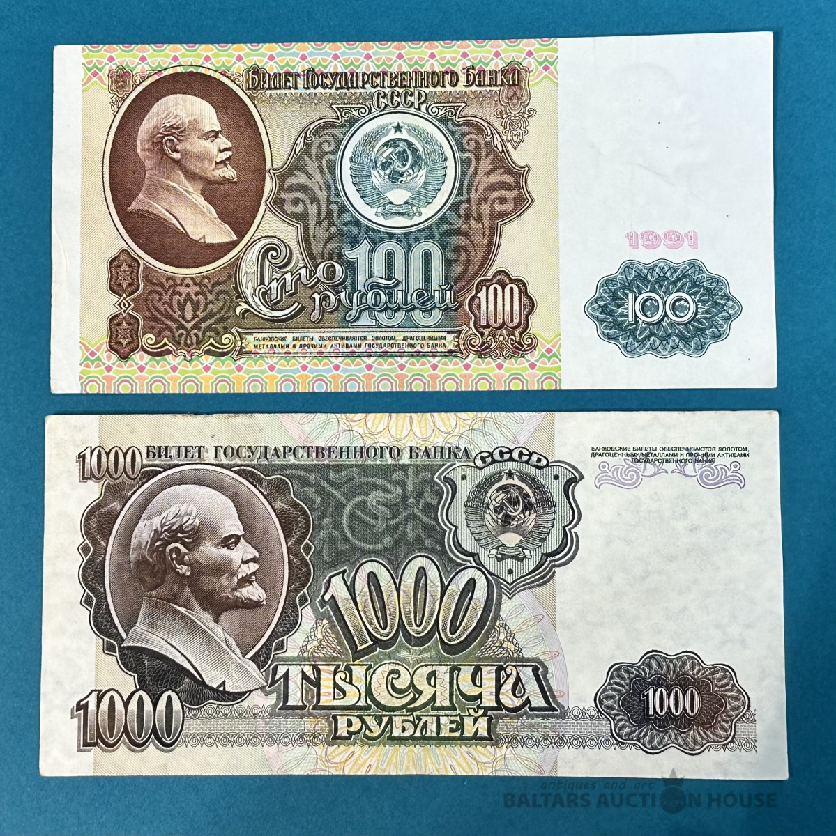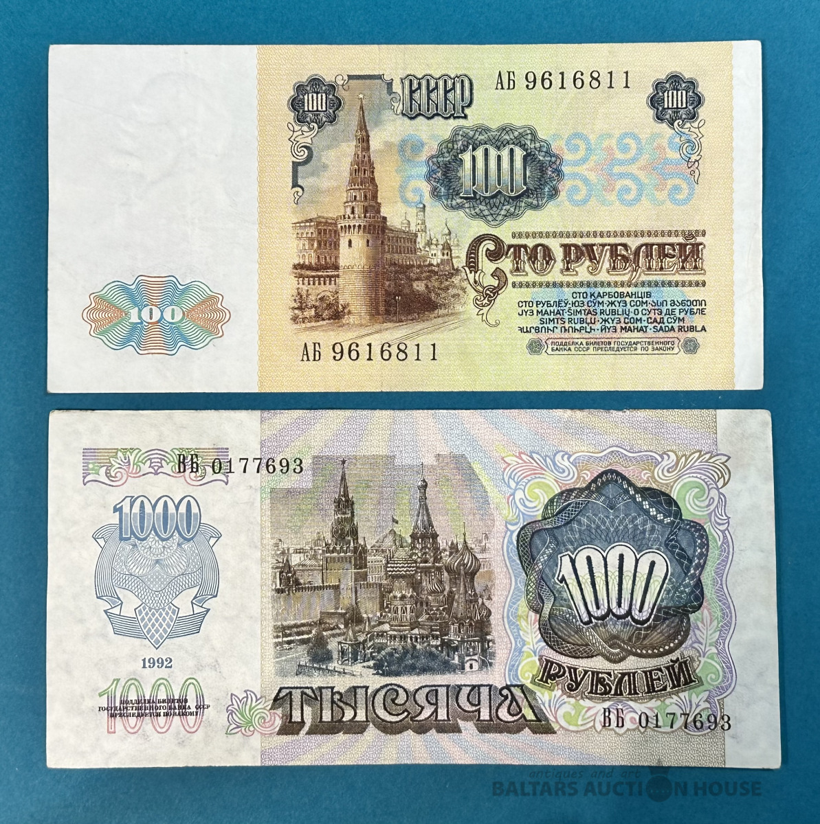 PSRS un Krievijas Federācijas banknotes, PSRS 100 rubļu nomināls un Federācijas 1000 rubļu nomināls, nelocītas