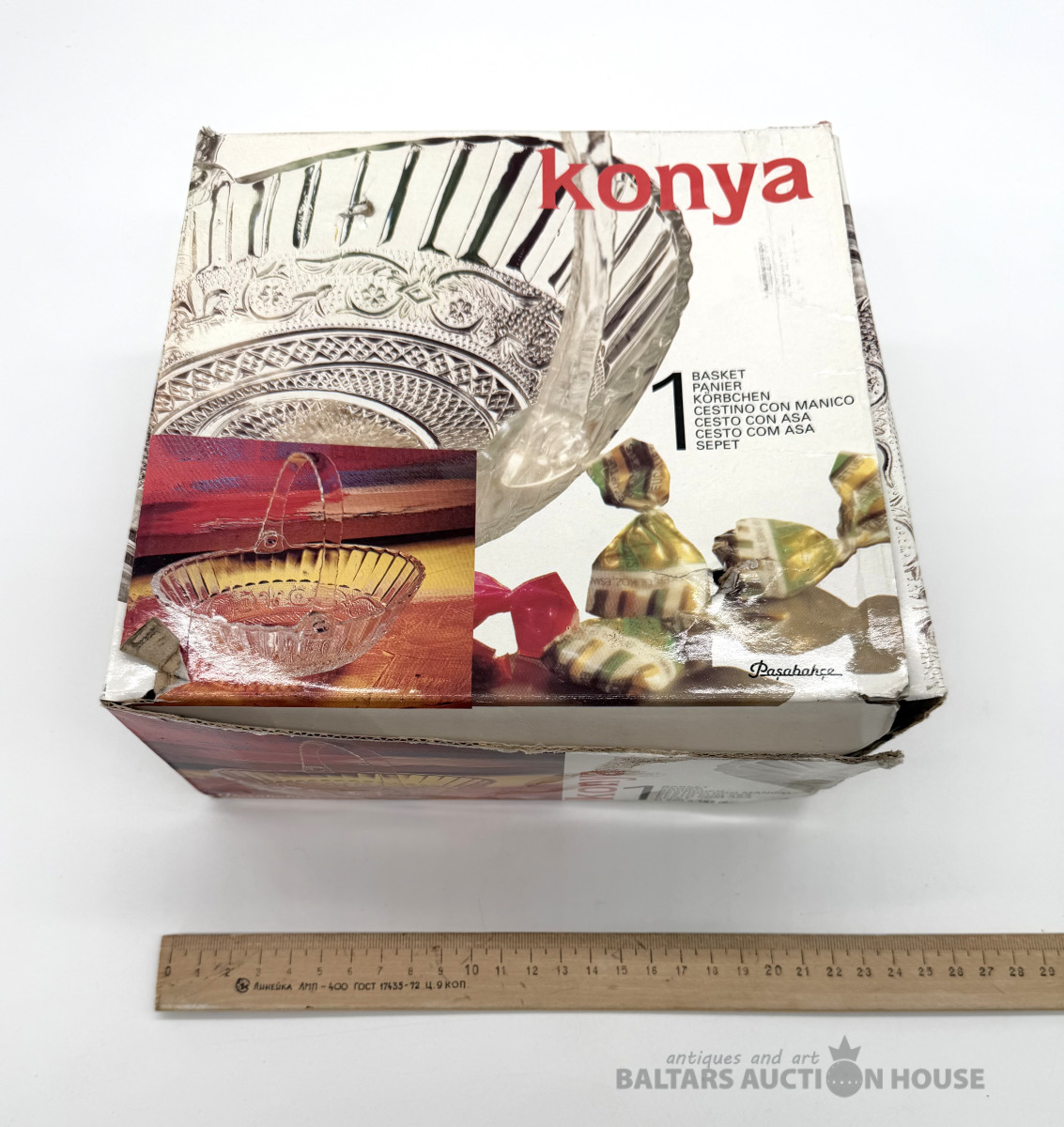 KRISTĀLSTIKLA TRAUCIŅŠ ar misiņa apmali un rokturi, trauciņa h=4,8 cm+rokturis, d=10 cm, ražots ap 1930.g.