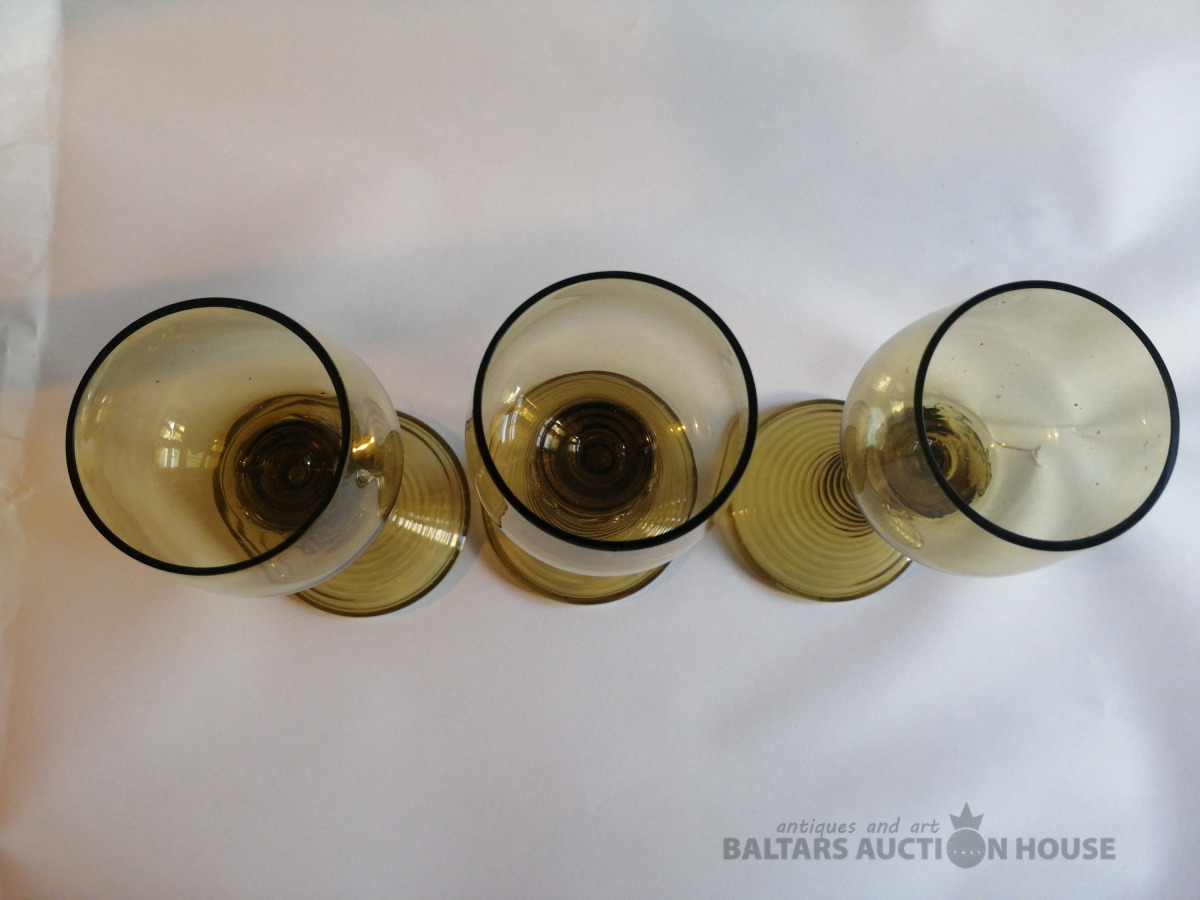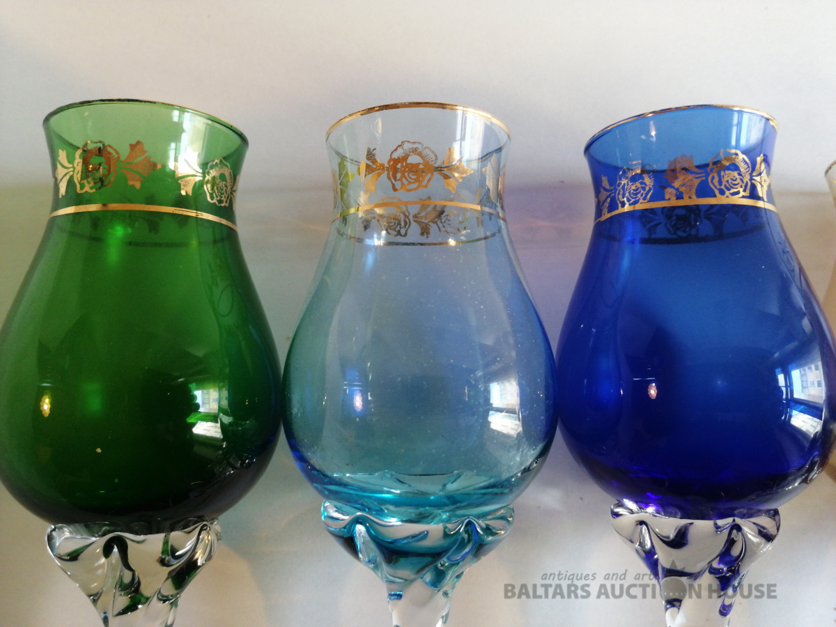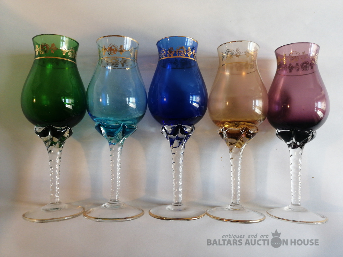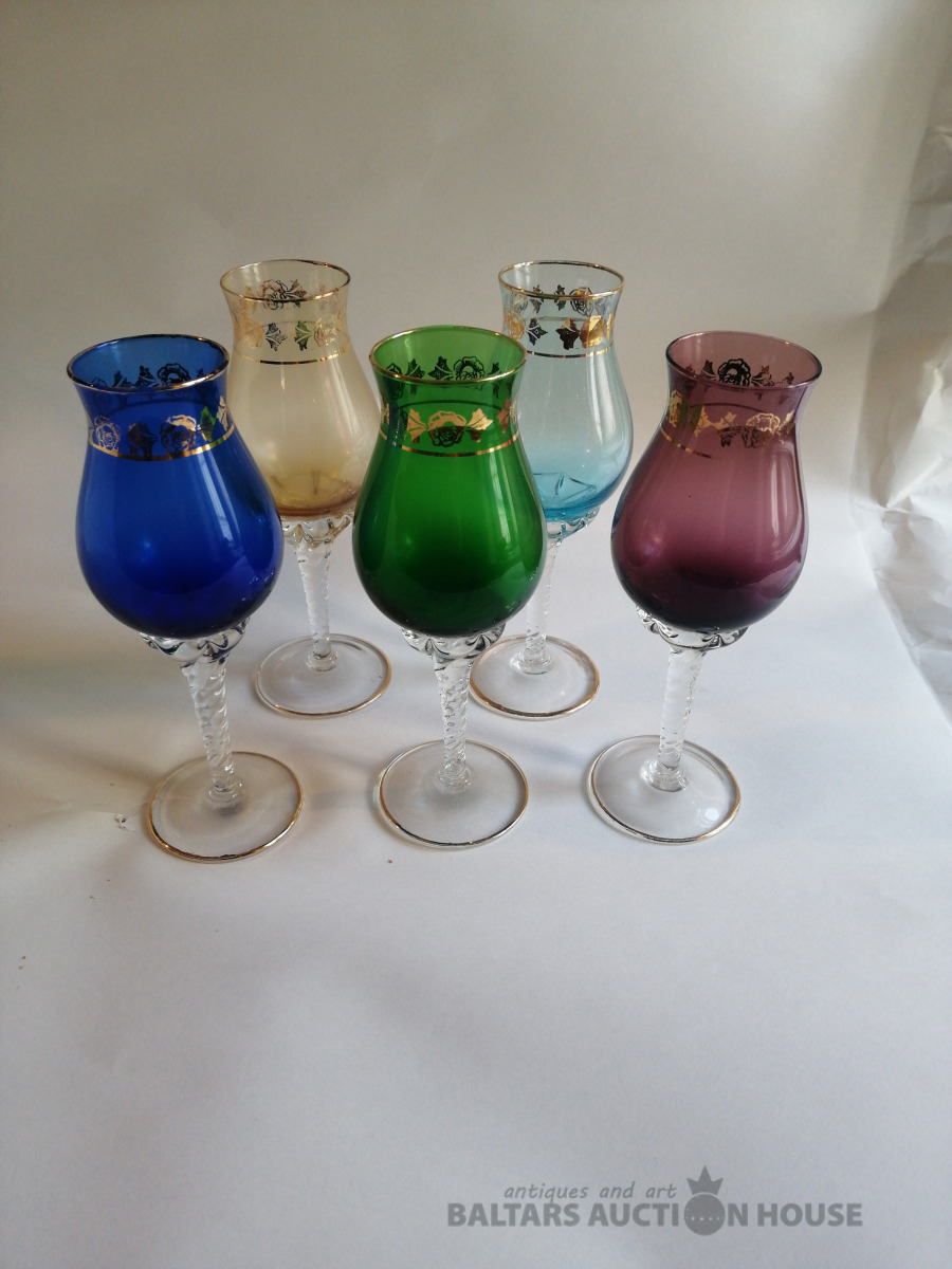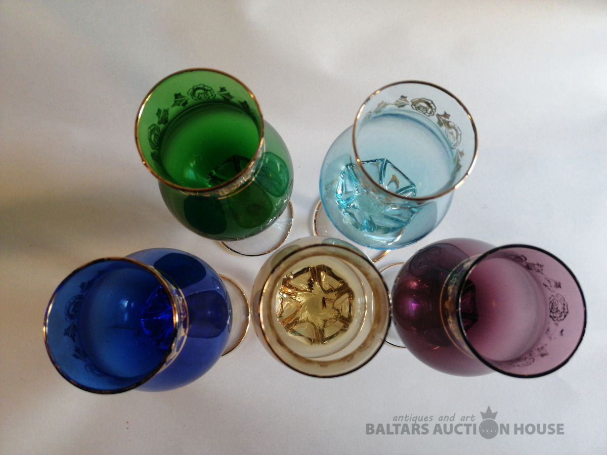 Glāzes (5 gab.), augstums 17,5 cm, krāsainais stikls, zeltījums, nelietotas