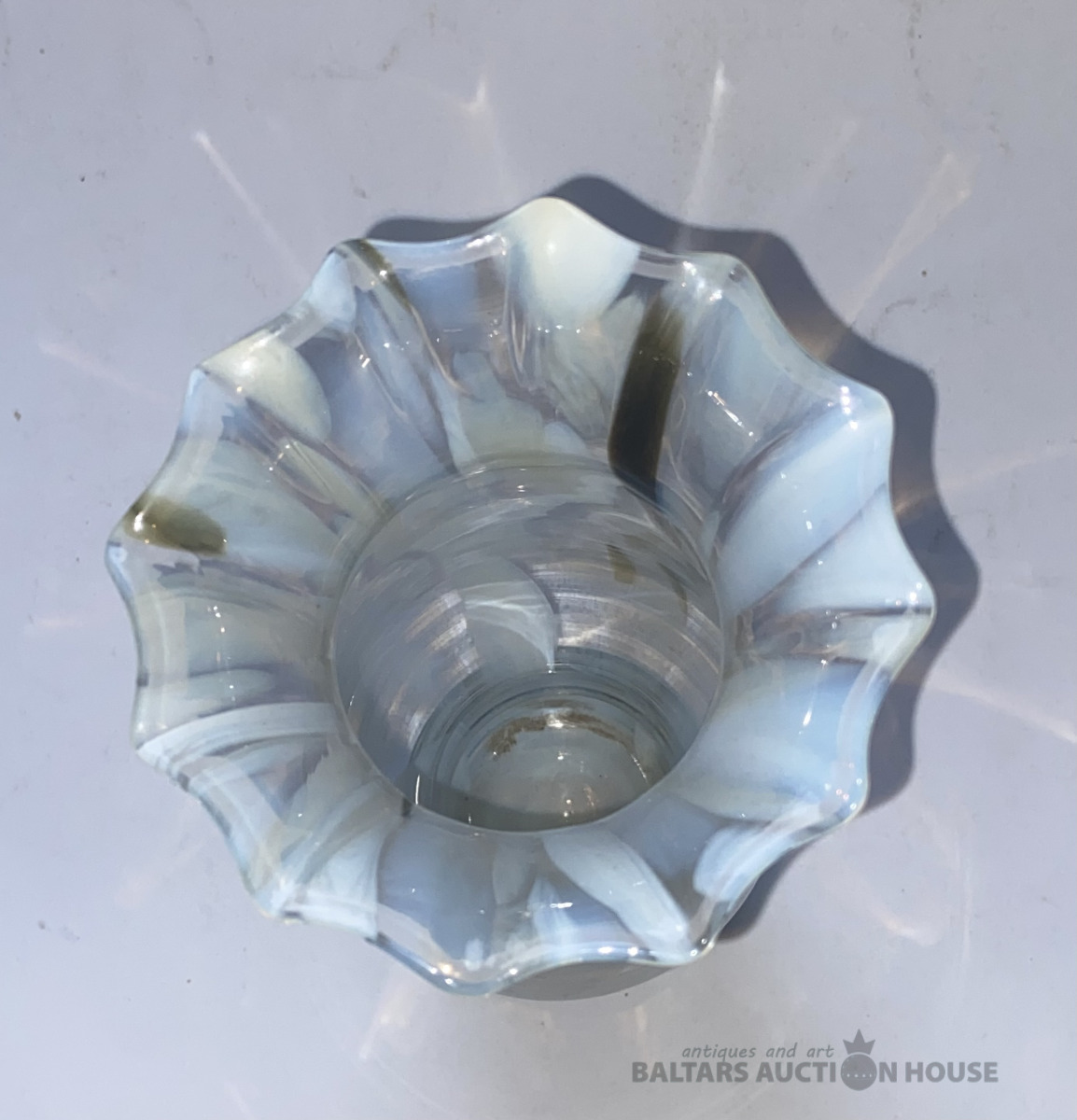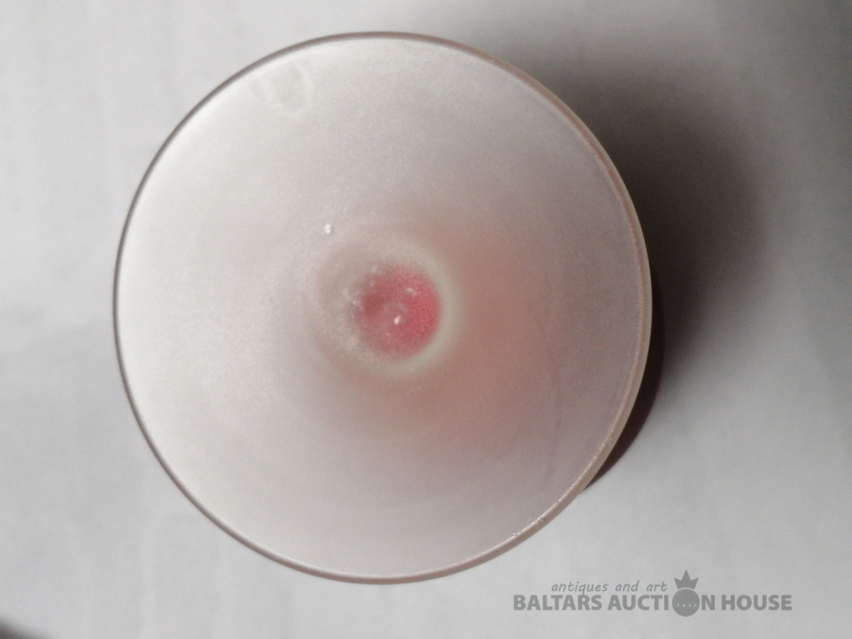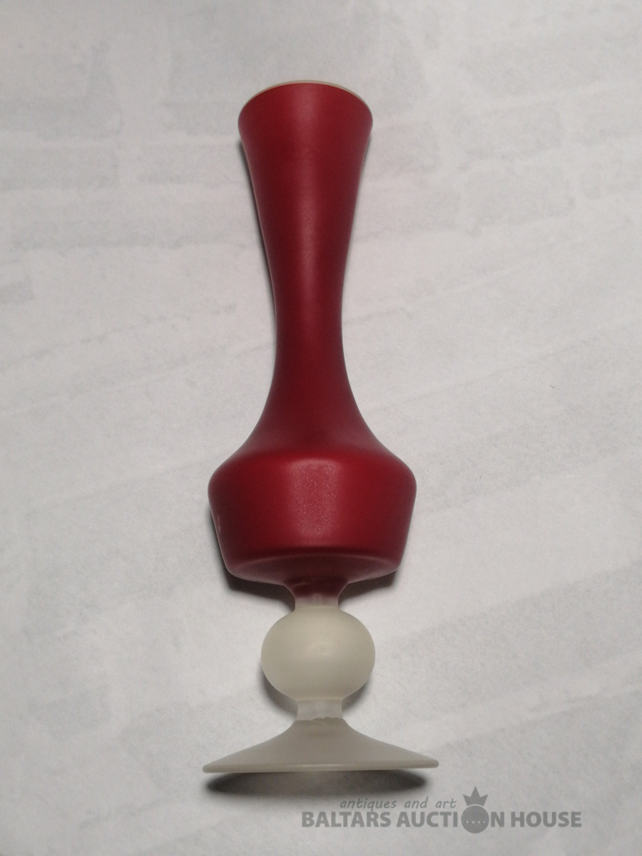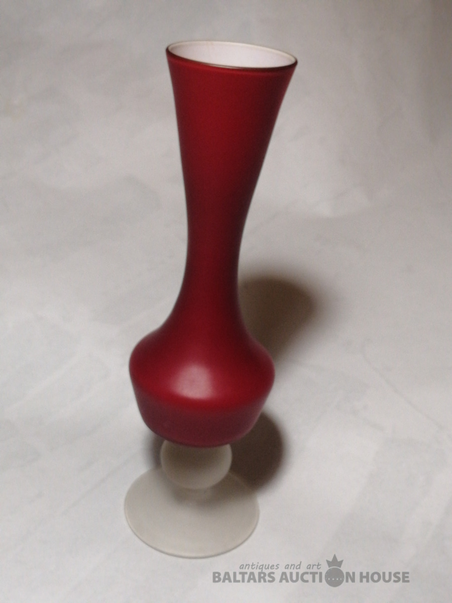 Vāze. Augstums 27 cm. Grezna vāze no trim stikla šķirnēm: kausu veido sarkanais un baltais stikls, pamatu pienstikls.