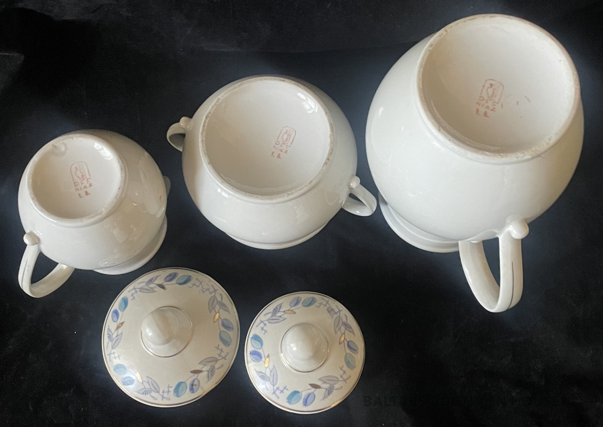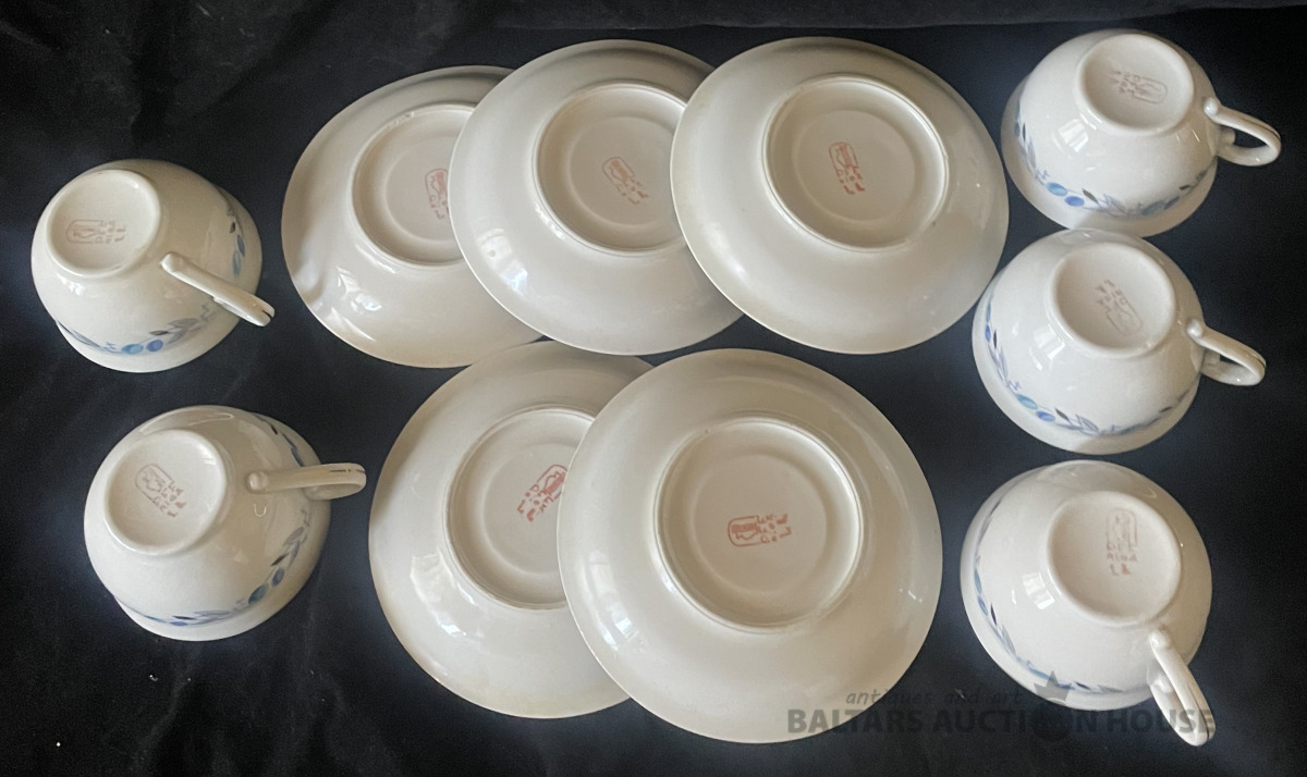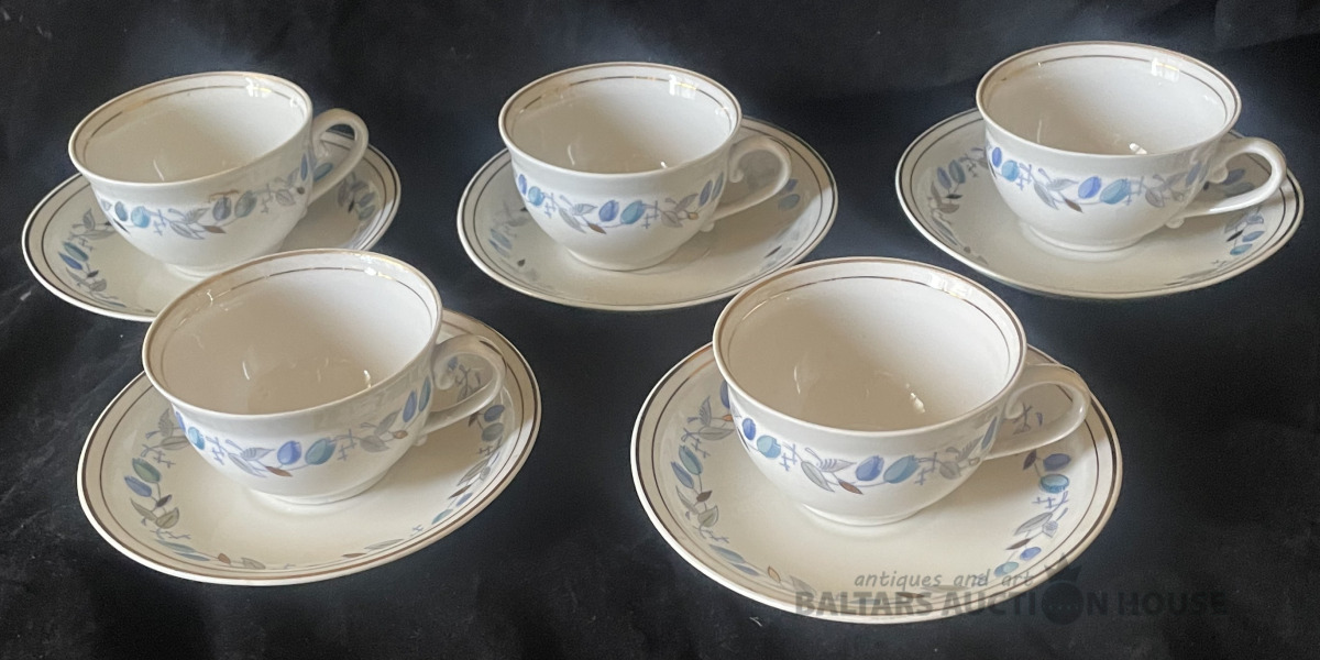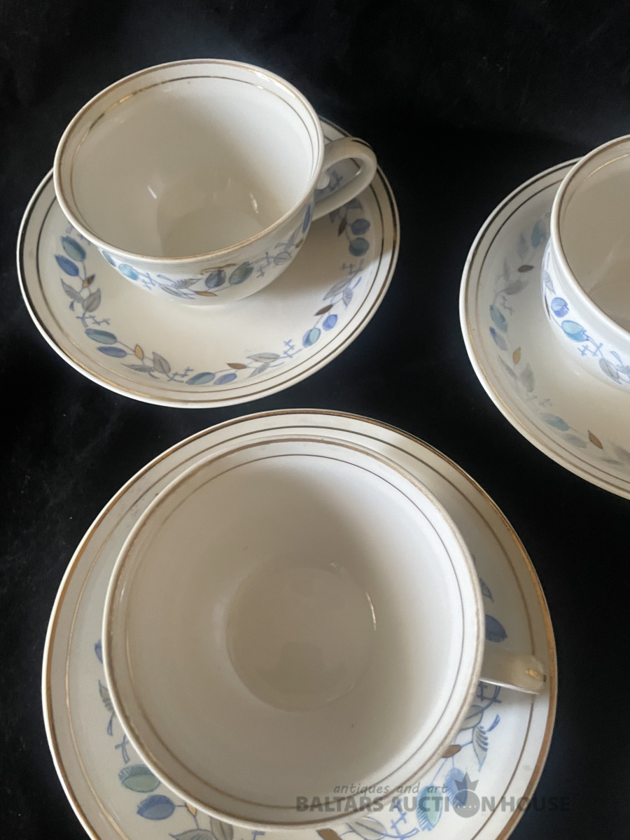 KAFIJAS SERVĪZE, 5 personām, porcelāns, RĪGA, PFF, 1.šķira, zeltījums labā stāvoklī, nav mazgāta kopš pēdējās lietošanas pirms daudziem gadiem. Tortes šķīvīšiem d=18,2 cm, apakštasēm d=14,9 cm.