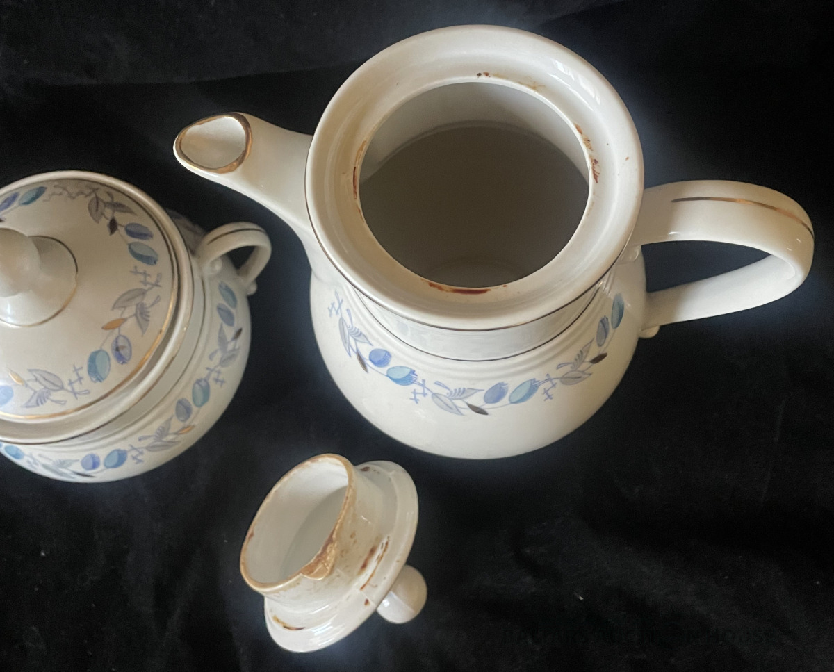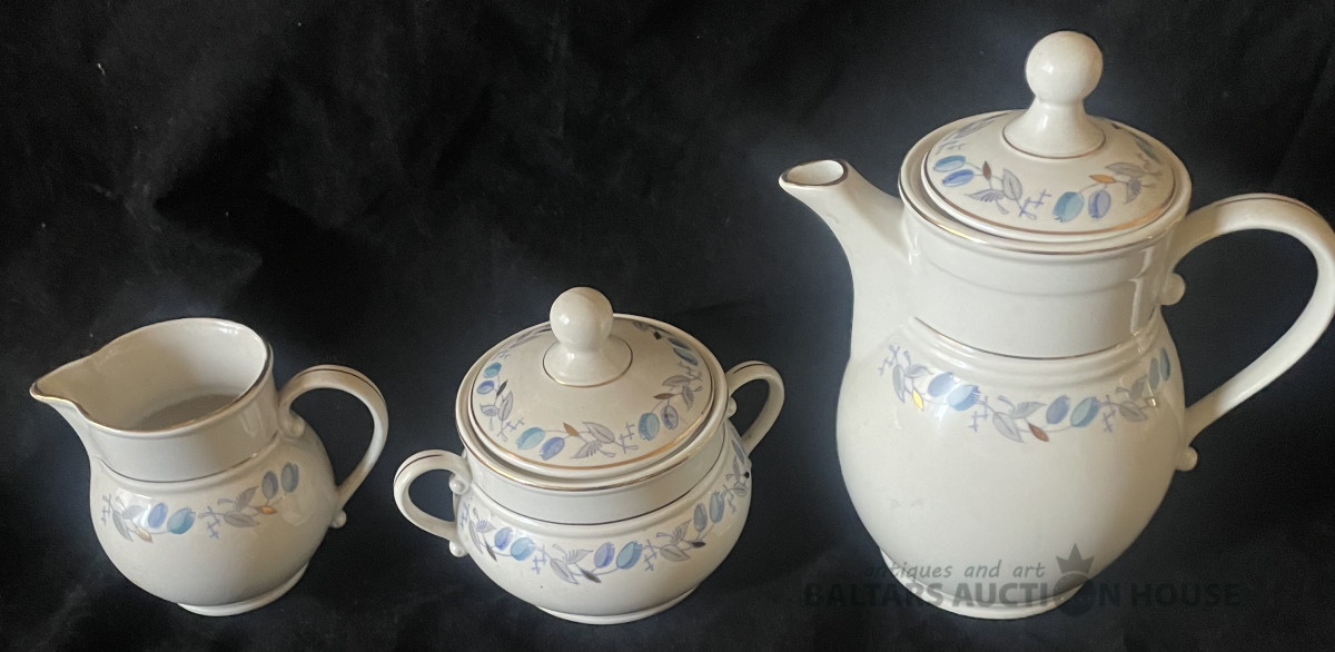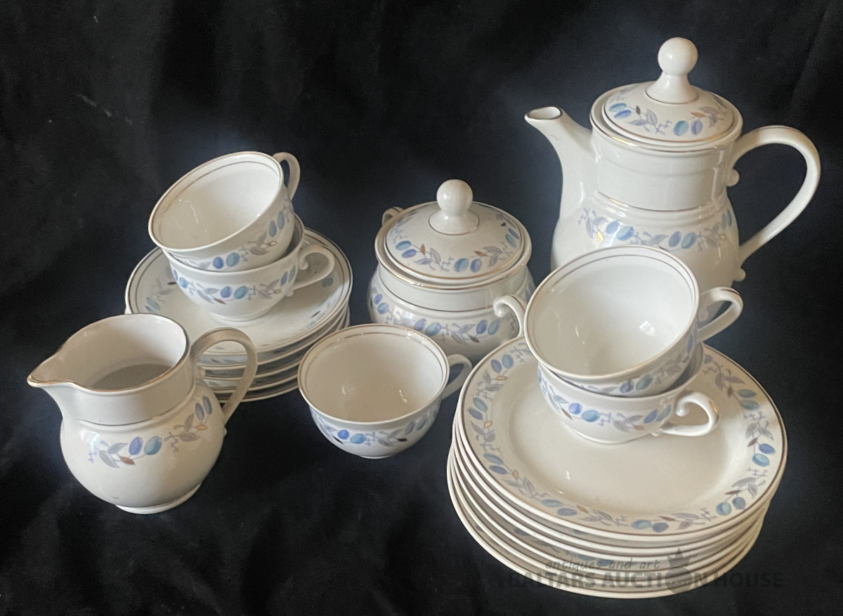 KAFIJAS SERVĪZE, 5 personām, porcelāns, RĪGA, PFF, 1.šķira, zeltījums labā stāvoklī, nav mazgāta kopš pēdējās lietošanas pirms daudziem gadiem. Tortes šķīvīšiem d=18,2 cm, apakštasēm d=14,9 cm.