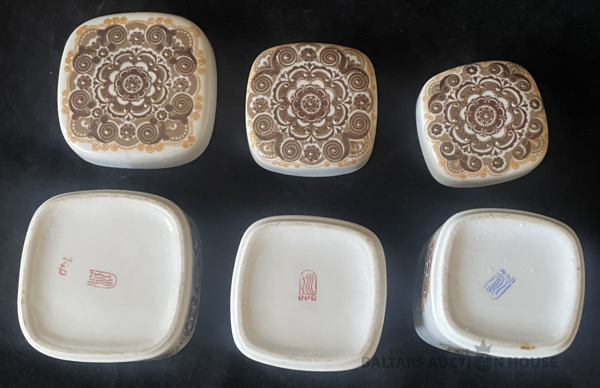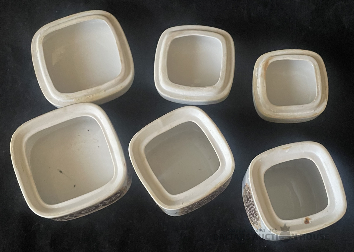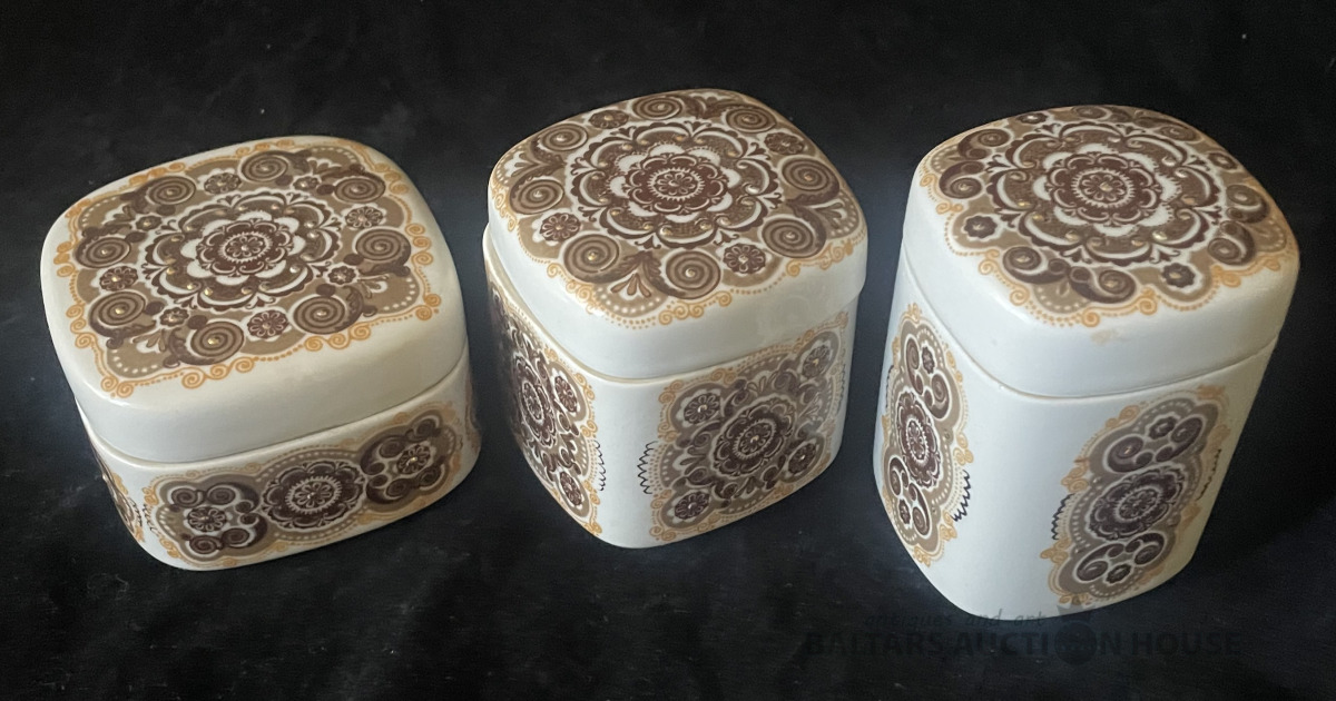TRAUCIŅI, 3 gab., porcelāns,zeltījums, Z.Ulstes mets, RPR RĪGA, h=6 cm un 7,8x7,8, h=6,8cm un 6,6x6,6 cm, h=8,4 cm un 5,8x5,8 cm, trauciņiem nav defektu, netīri, nav mazgāti