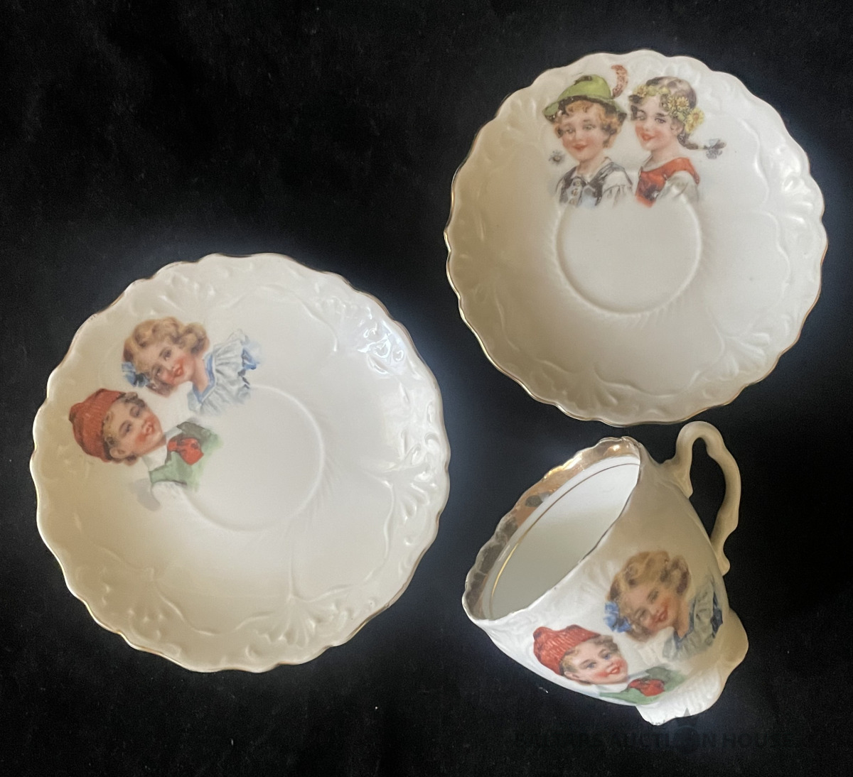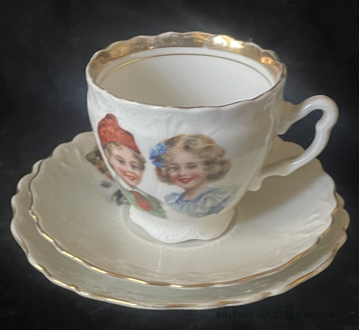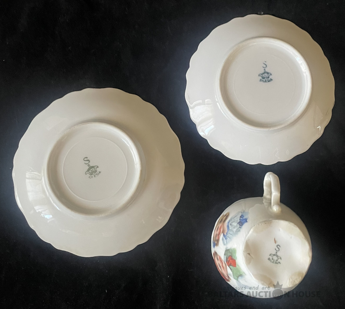 KAFIJAS TRIO, porcelāns, dekols, skaists zeltījums,, tasei h=6,1 cm, šķīvīšu d=11,7 un 12,7 cm, Silesia f-ka, ap 1930.g.