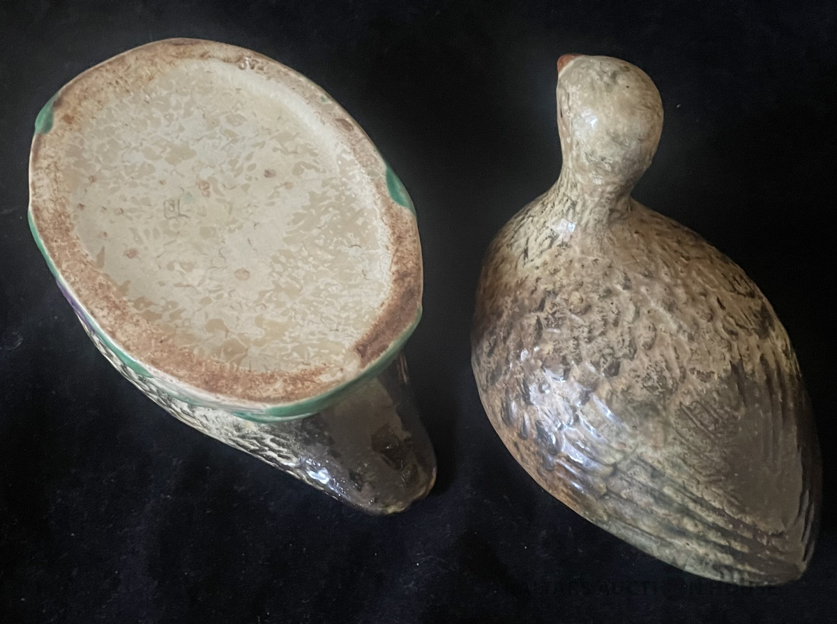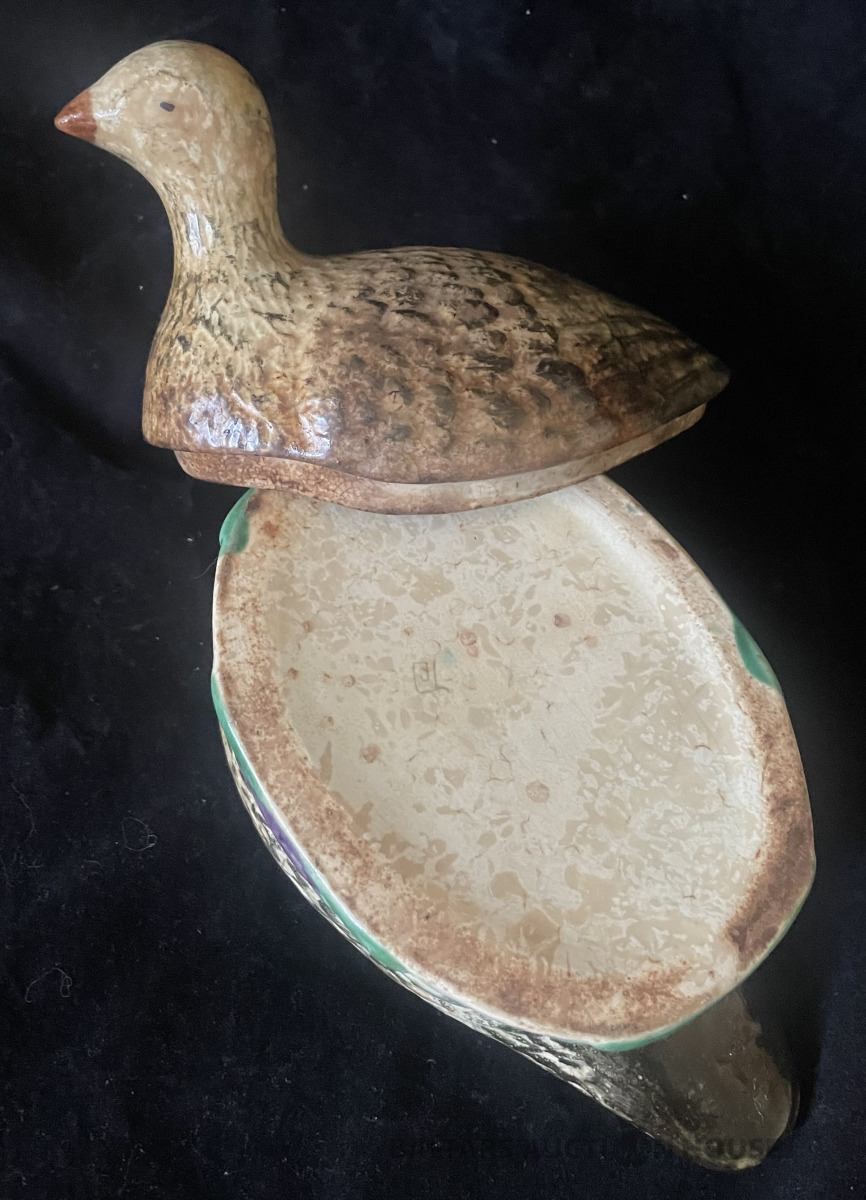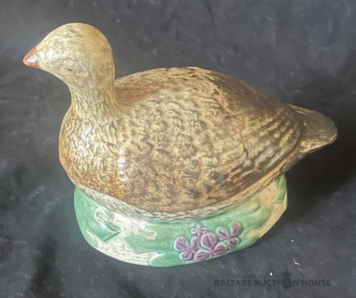 SVIESTA TRAUKS, Pīle, fajanss, h=13 cm un 14,8x9,2 cm, vistcamāk autordarbs, marķējums vāka iekšpusē, Eiropa, ap 1930.g., ir plaisa, 3 cm gara,,kur pīlei kakls un vecuma nomelnējums pilnā platībā !!!