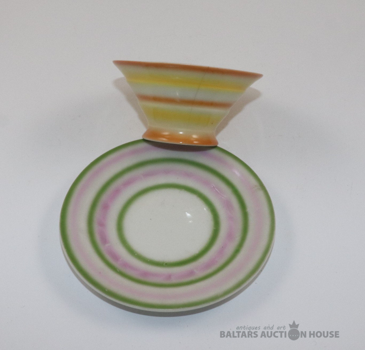 Tase ar apakštasi. Porcelāns, h=4,7 cm. d=8,2 un 11 cm. Tasei plaisa.