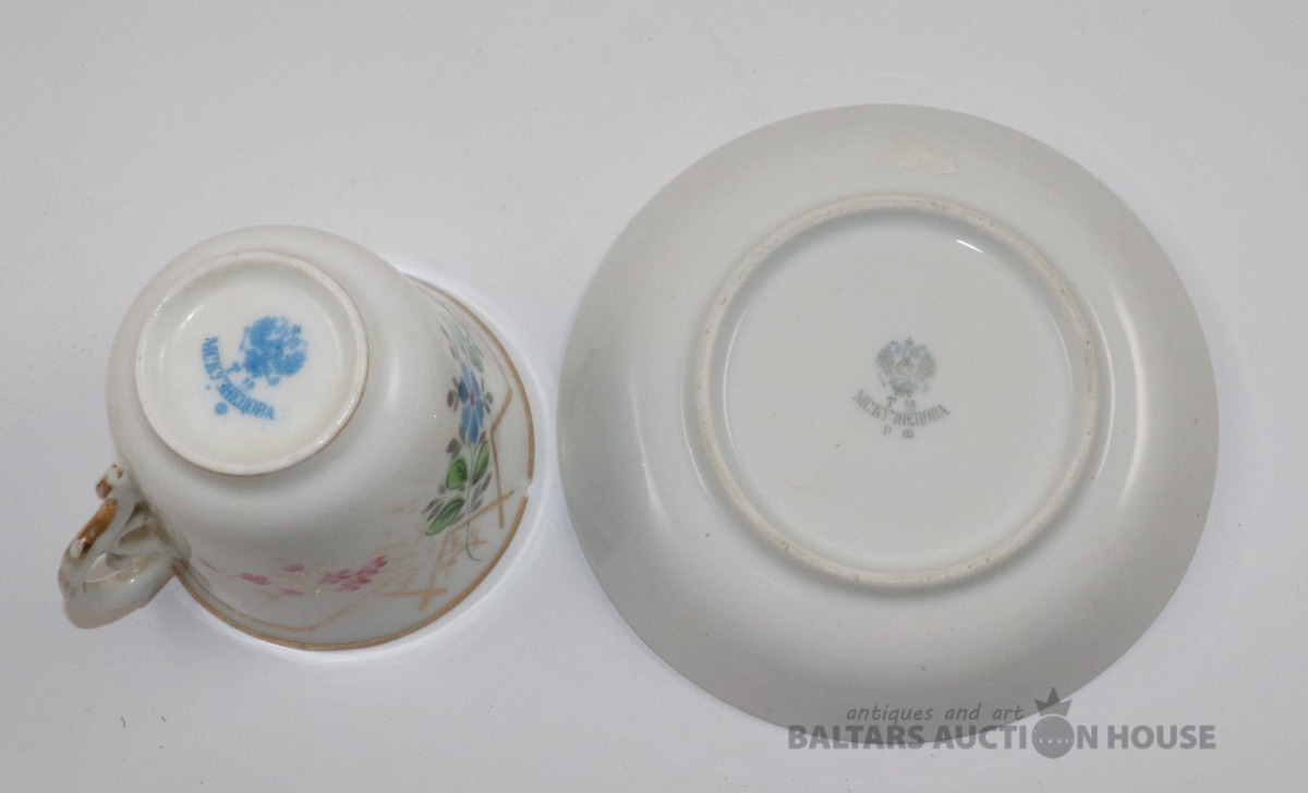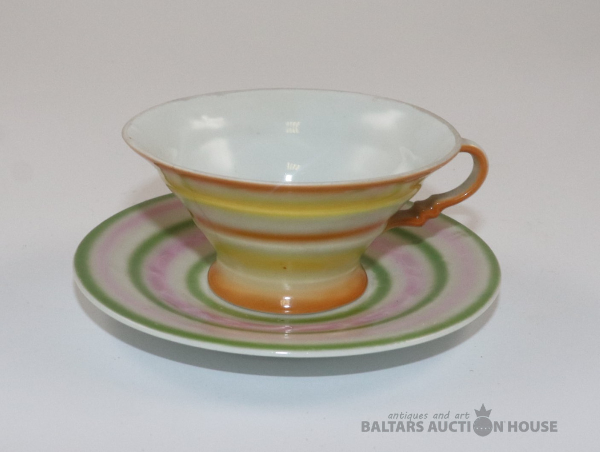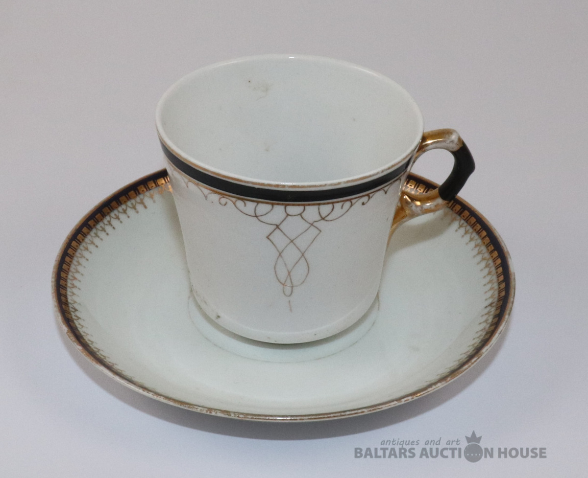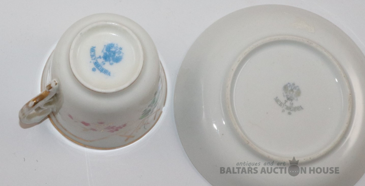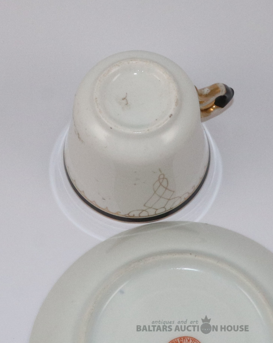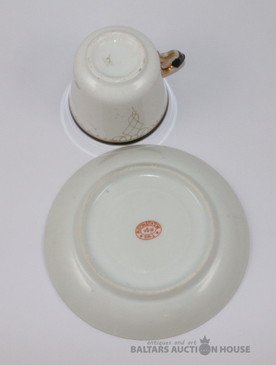 Tase ar apakštasi. Porcelāns, Kuzņecova fab., h=7,5 cm. d=8,2 un 14,2 cm. Tasei plaisa un nošķēlums, apakštasei plaisa.