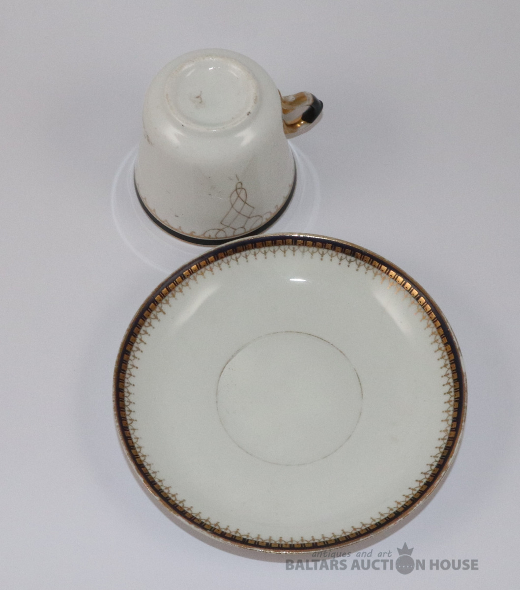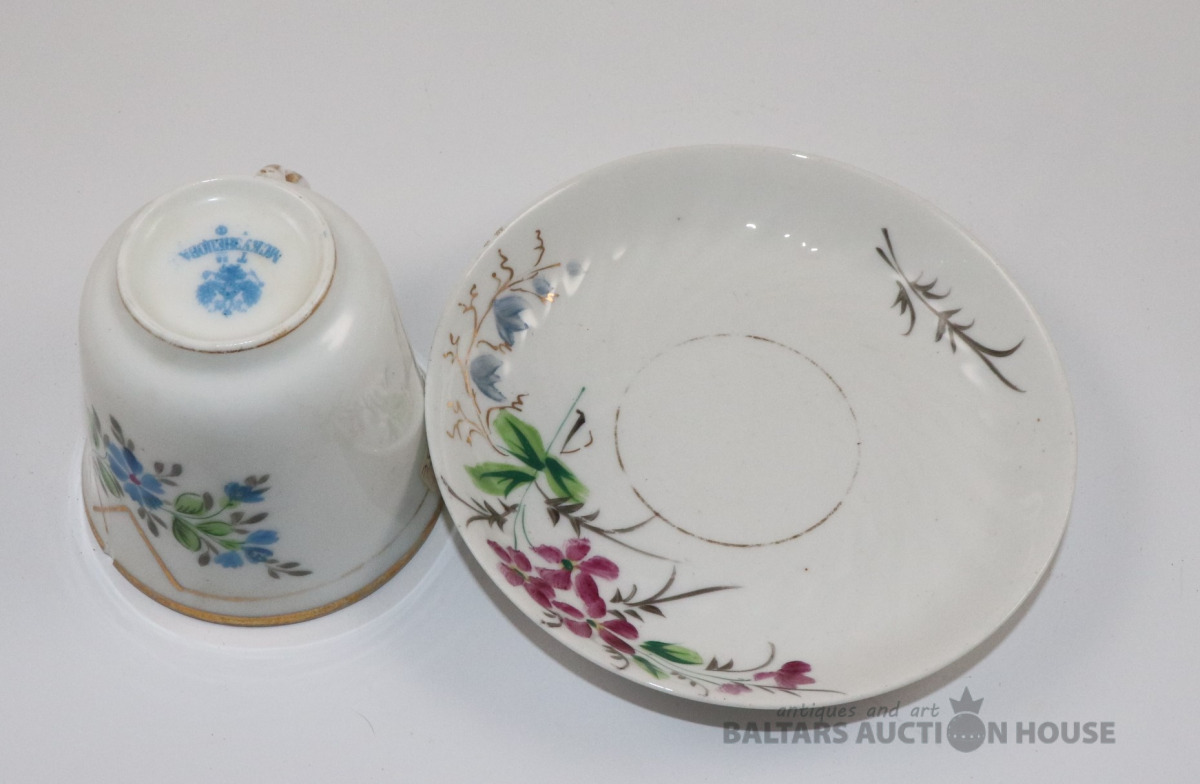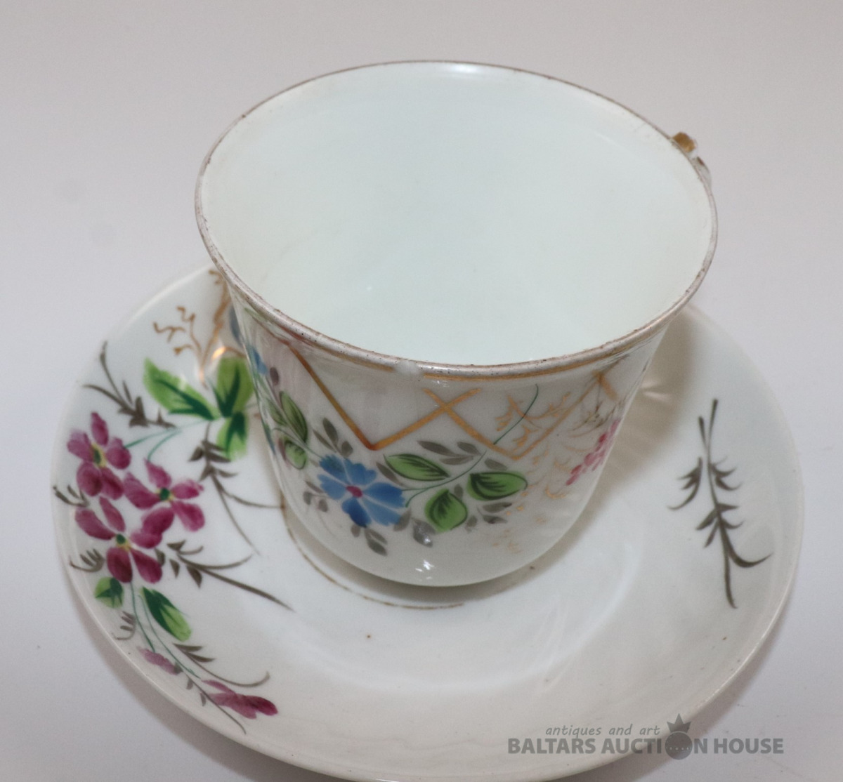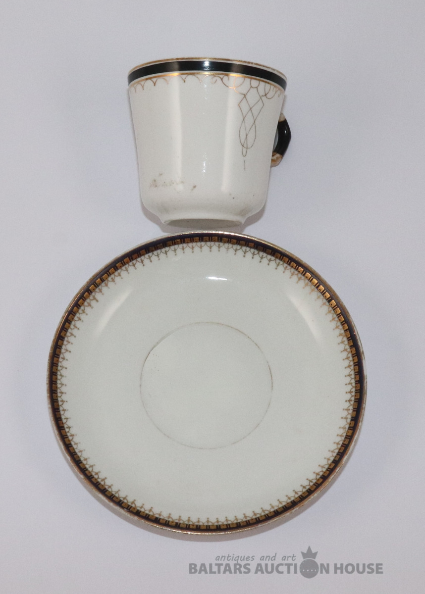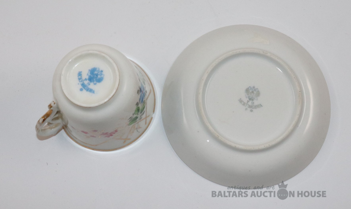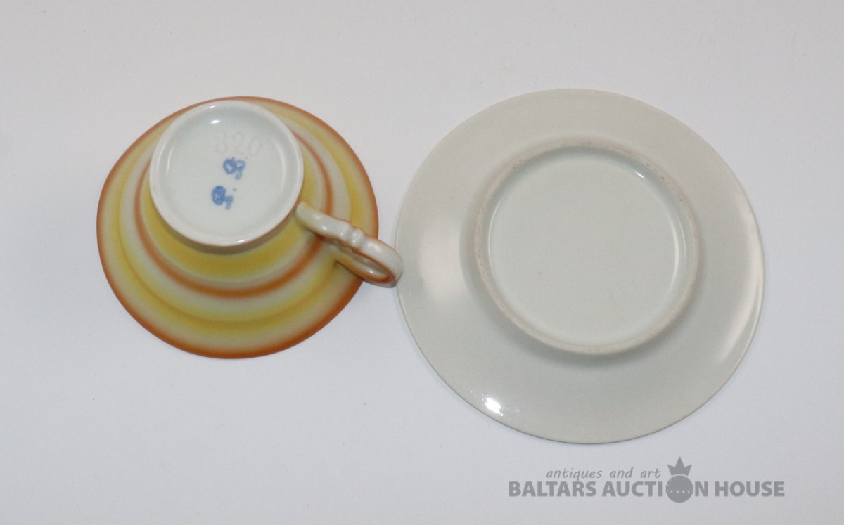 Tase ar apakštasi. Porcelāns, Kuzņecova fab., h=7,5 cm. d=8,2 un 14,2 cm. Tasei plaisa un nošķēlums, apakštasei plaisa.