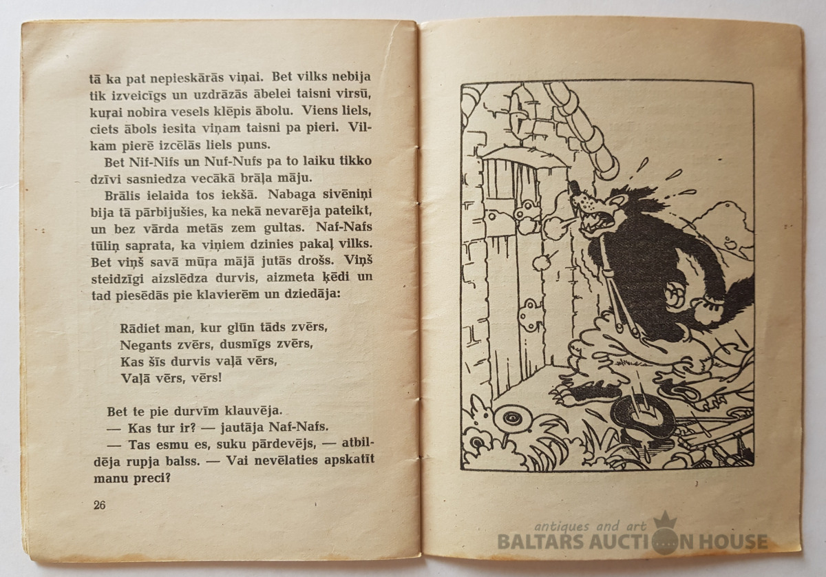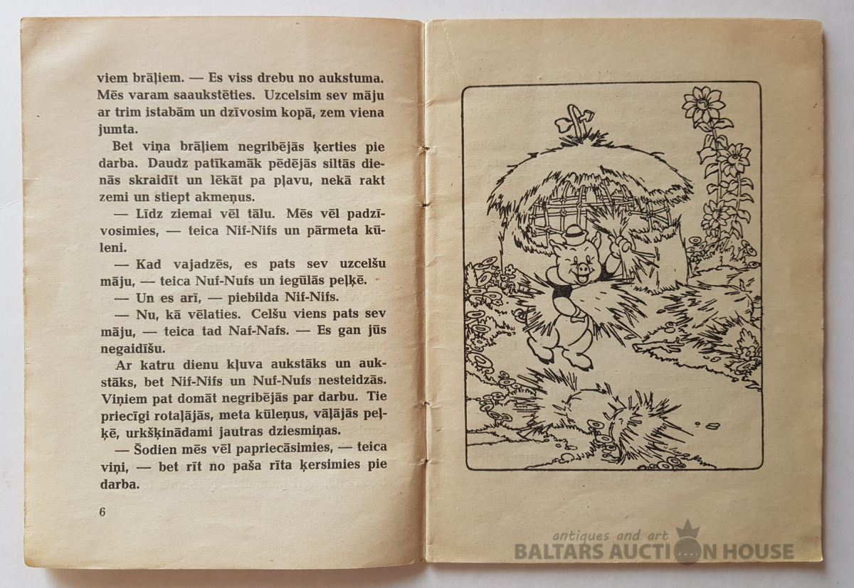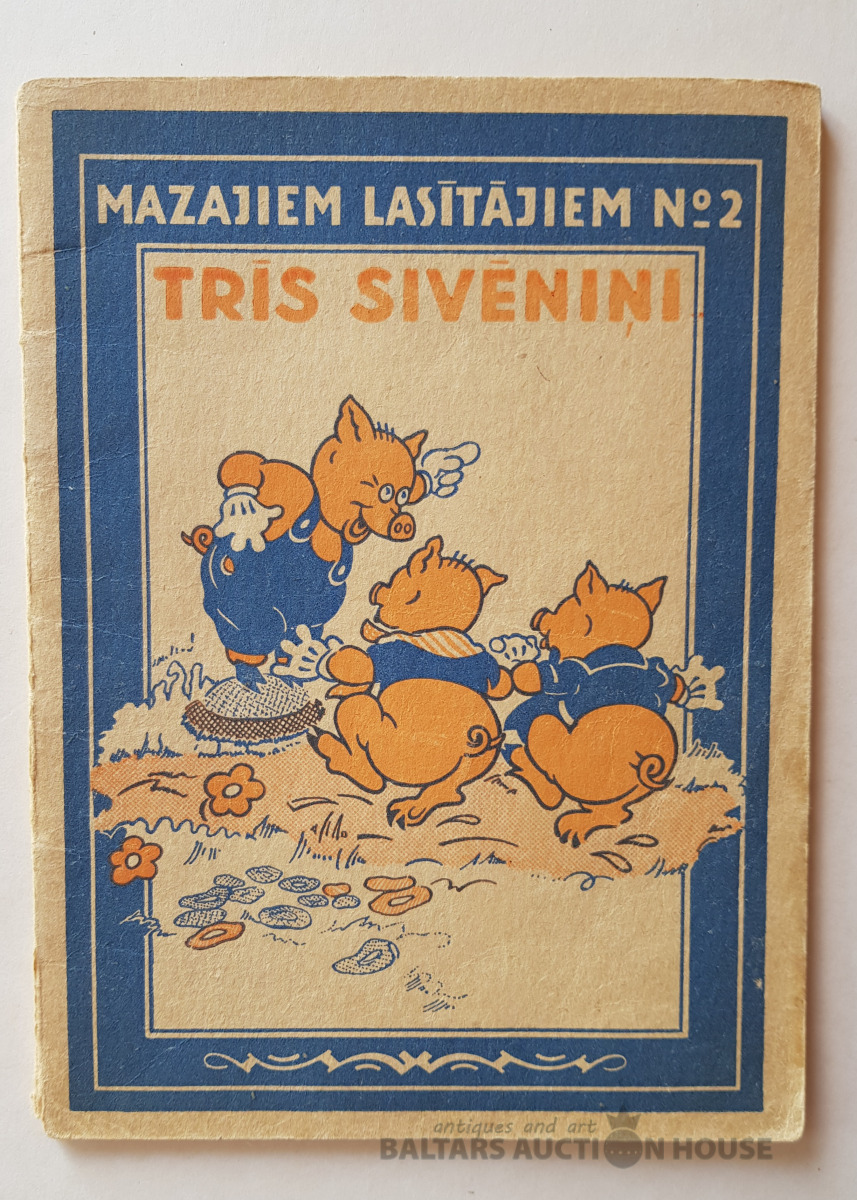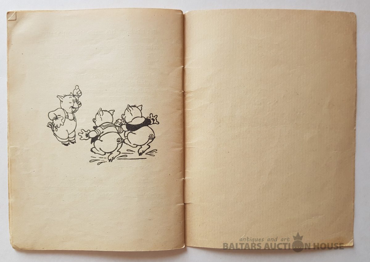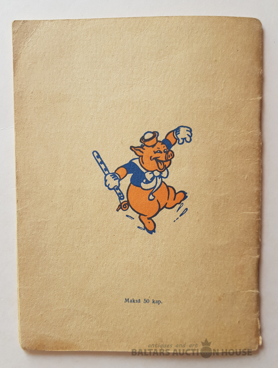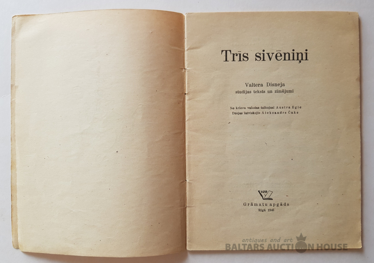 "Trīs sivēntiņi", Grāmatu apgāds, 1946. Valtera Disneja studijas teksts un zīmējumi. Dzejas latviskojis Aleksandrs Čaks. Sērija "Mazajiem lasītājiem" Nr. 2.