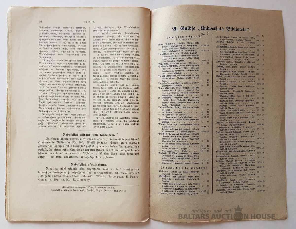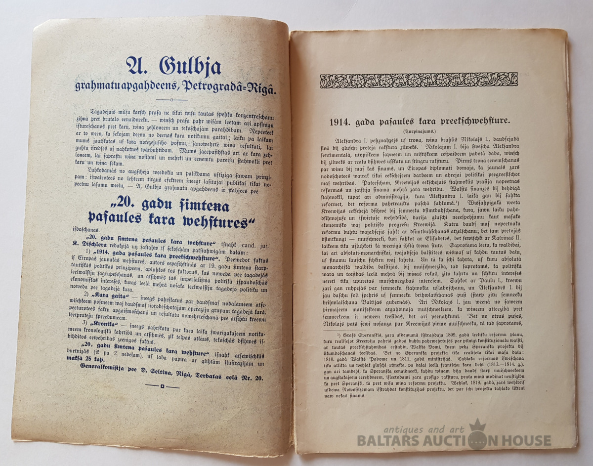 "XX gadu simteņa pasaules kara vēsture", burtnīca Nr. 2, A. Gulbja apgādībā, 1914. K. Dišlera redakcijā.