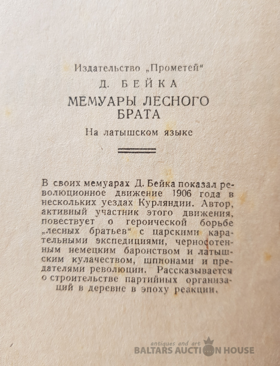 Dāvids Beika "Mežabrāļu gads. Cīņas un cilvēki Piektā gada revolūcijā. Memuari", PROMETEJS, Maskavā, 1937.