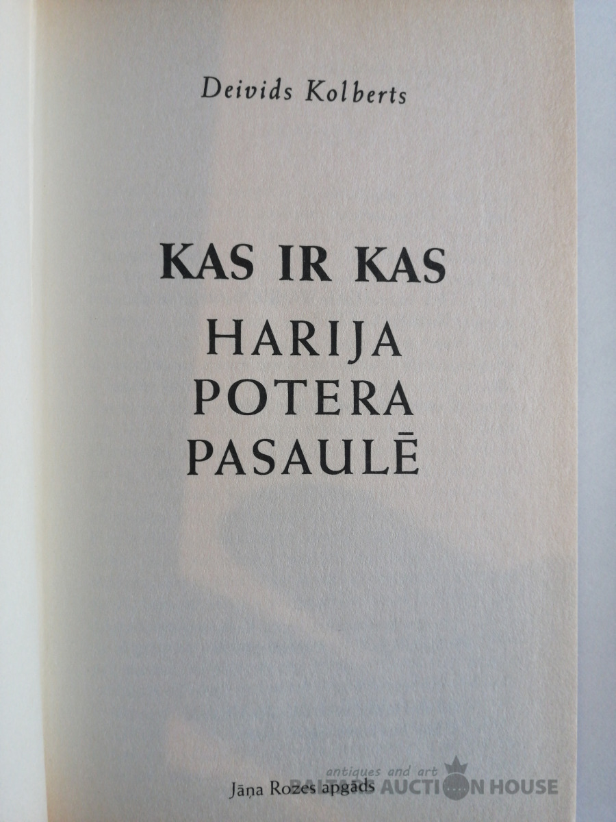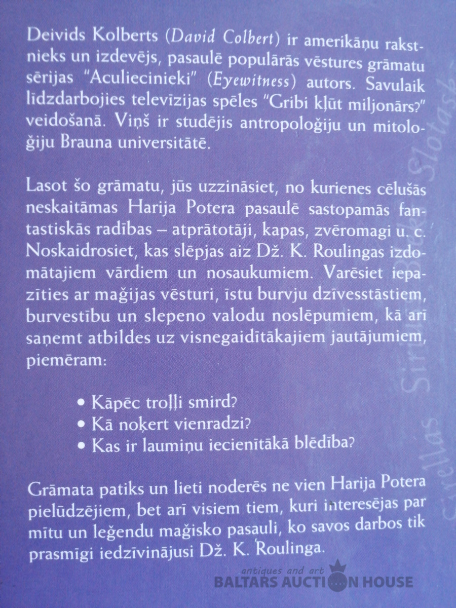 Deivids Kolberts "Kas ir kas Harija Potera pasaulē", Jāņa Rozes apgāds, 2004., 199 lpp., jauna. Roulingas grāmatās par Hariju Poteru ir daudz kultūratsauču - ne varoņu vārdi, ne vietu nosaukumi nav nejauši; konteksta pārzināšana padarīs grāmatas izpratni daudz dziļāku un lasīšanu vērtīgāku.55 a .
