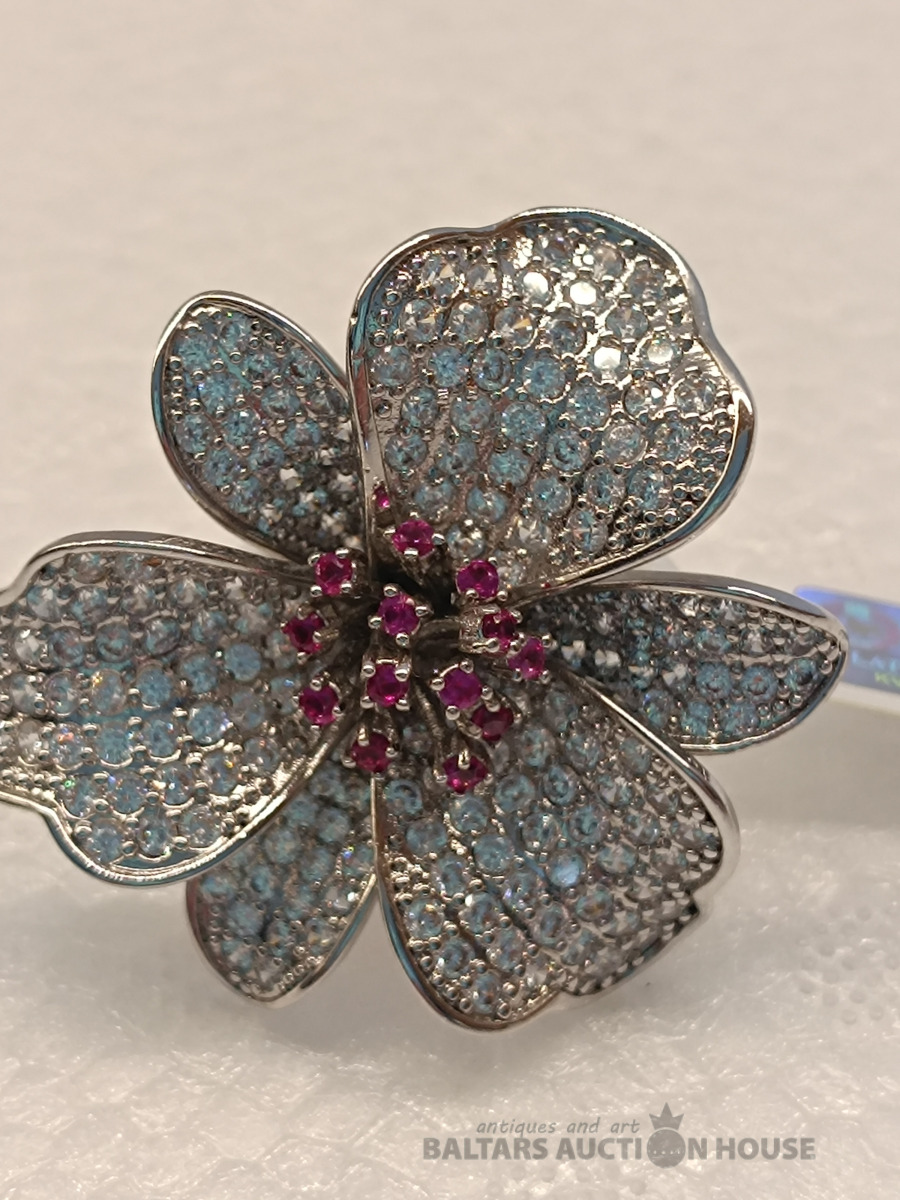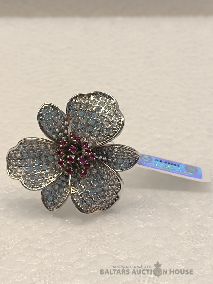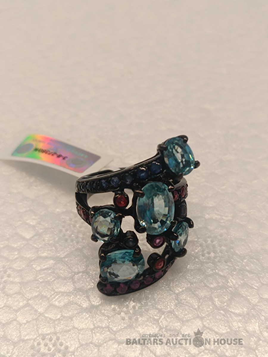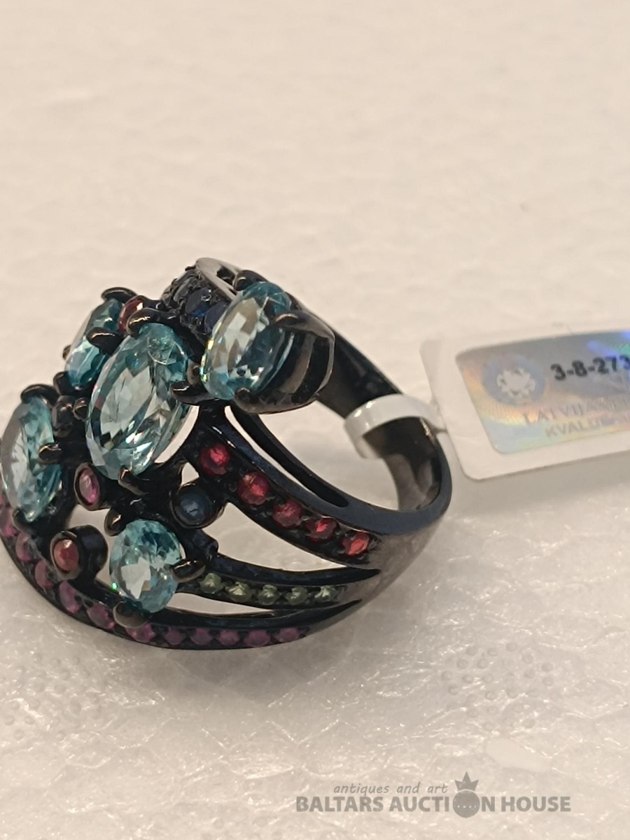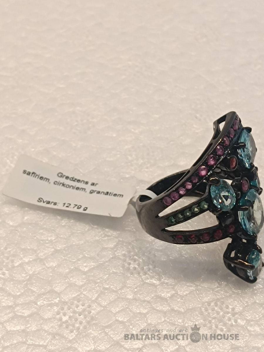 Ļoti skaists sudraba 925 gredzens ar safīriem, cirkoniem un granātiem Izmērs: 18 Svars: 12.79