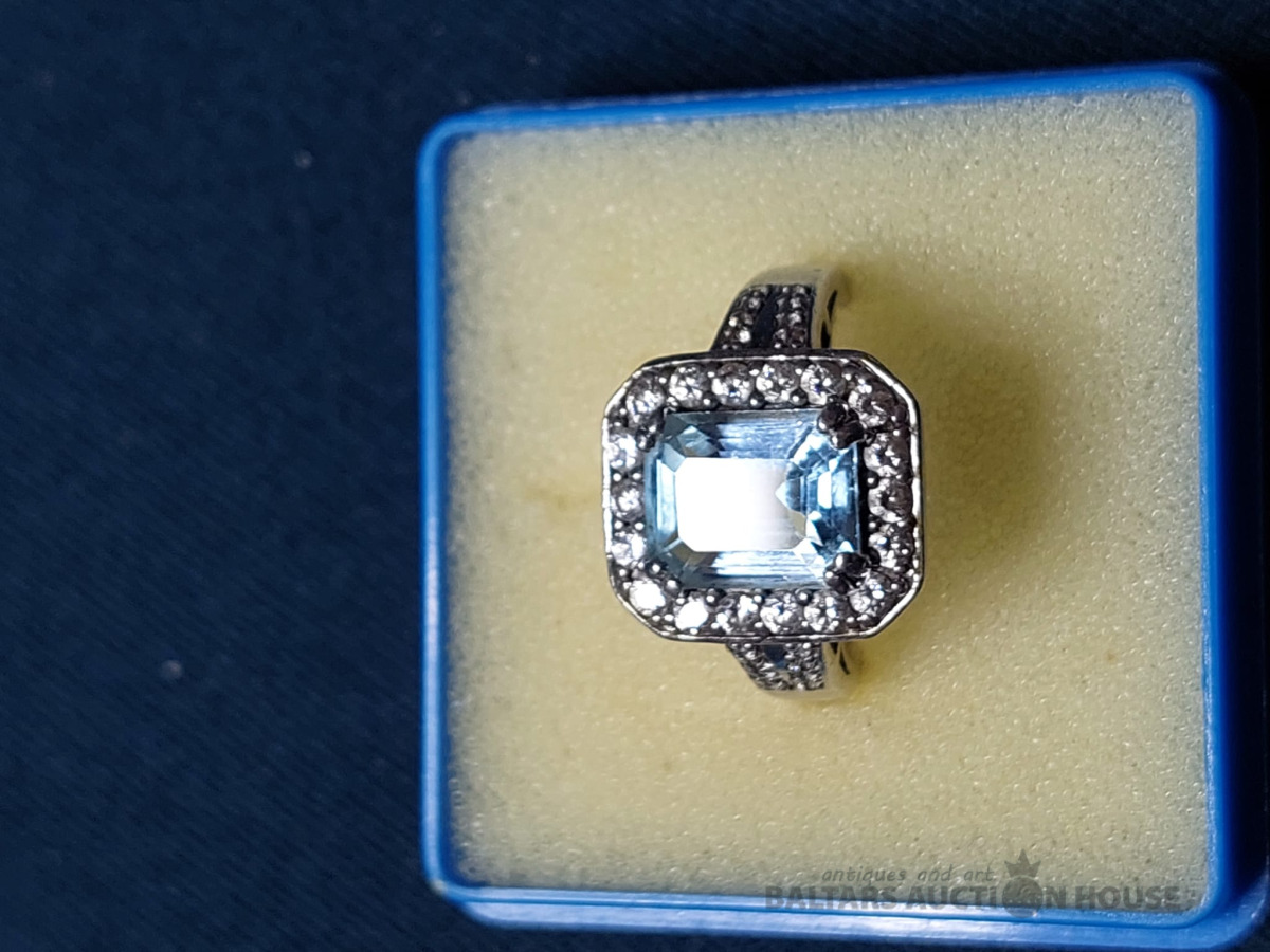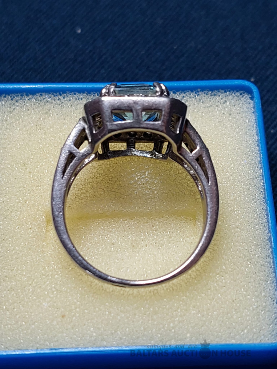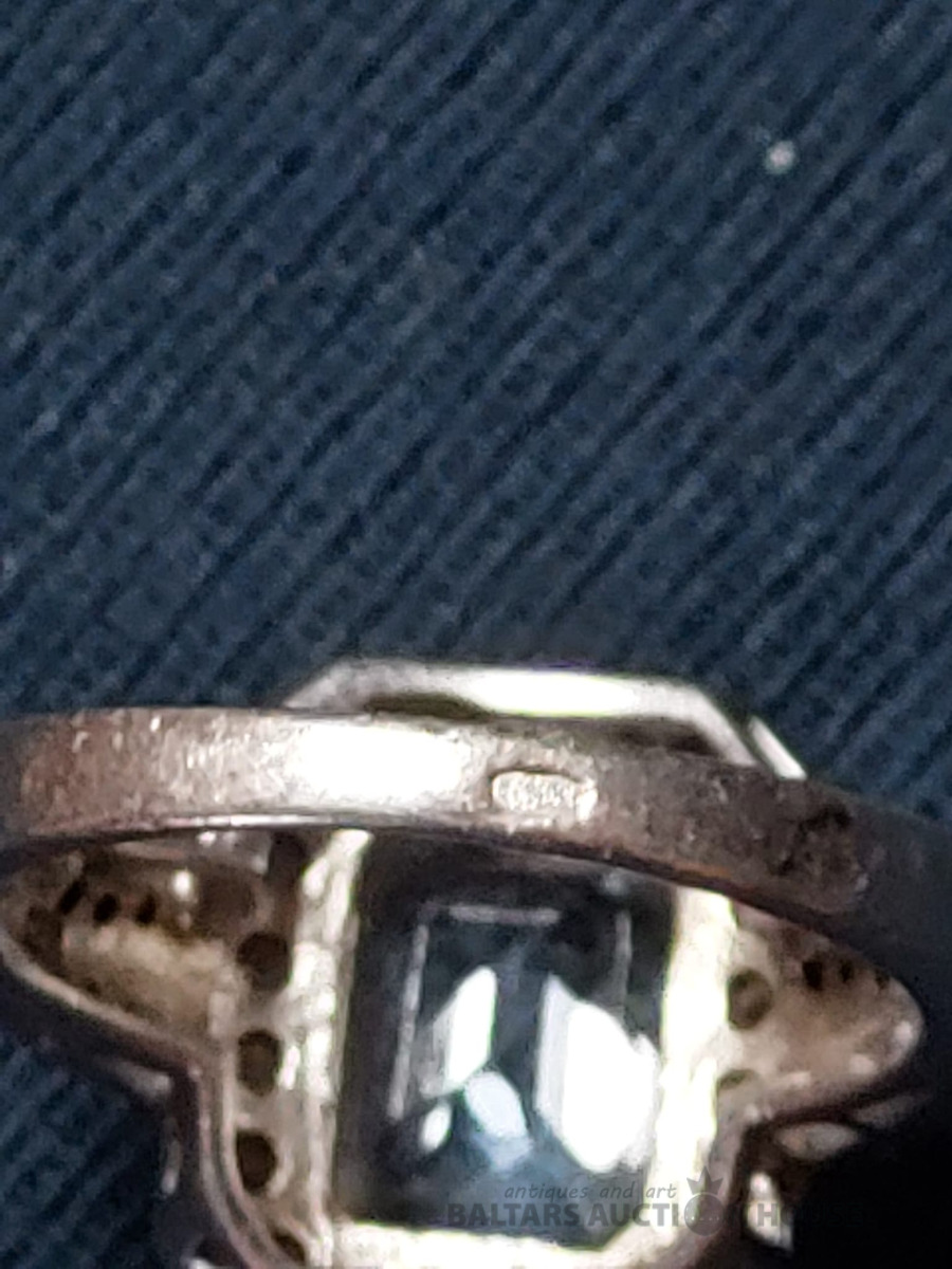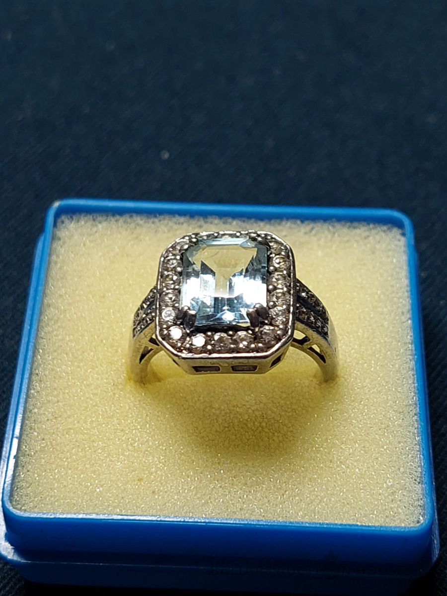 Elegants sudraba gredzens ar dabīgo akvamarīnu un fianītiēm.925prove, izm. 18.