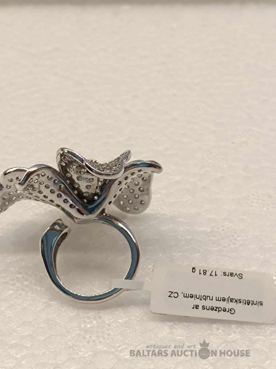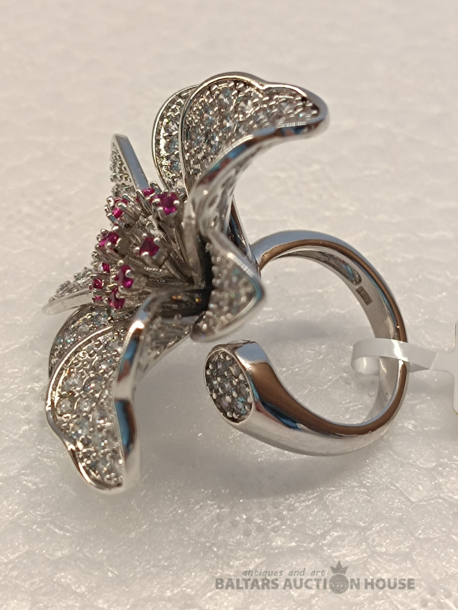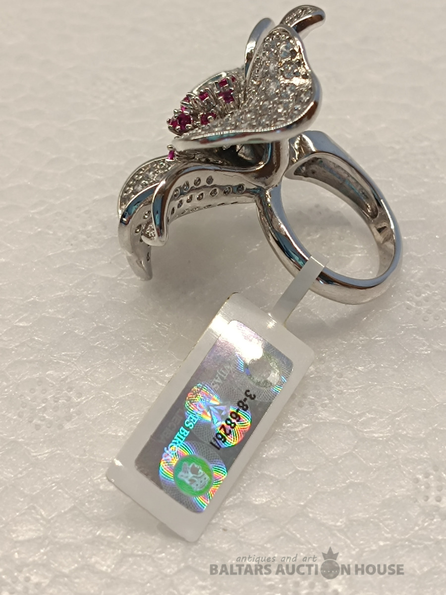 Ļoti skaists gredzens ar sintētiskajiem rubīniem un cirkonijiem. izmērs: regulējams