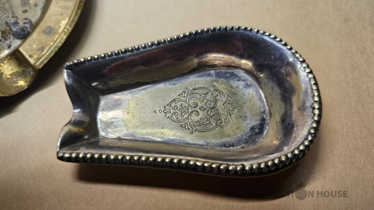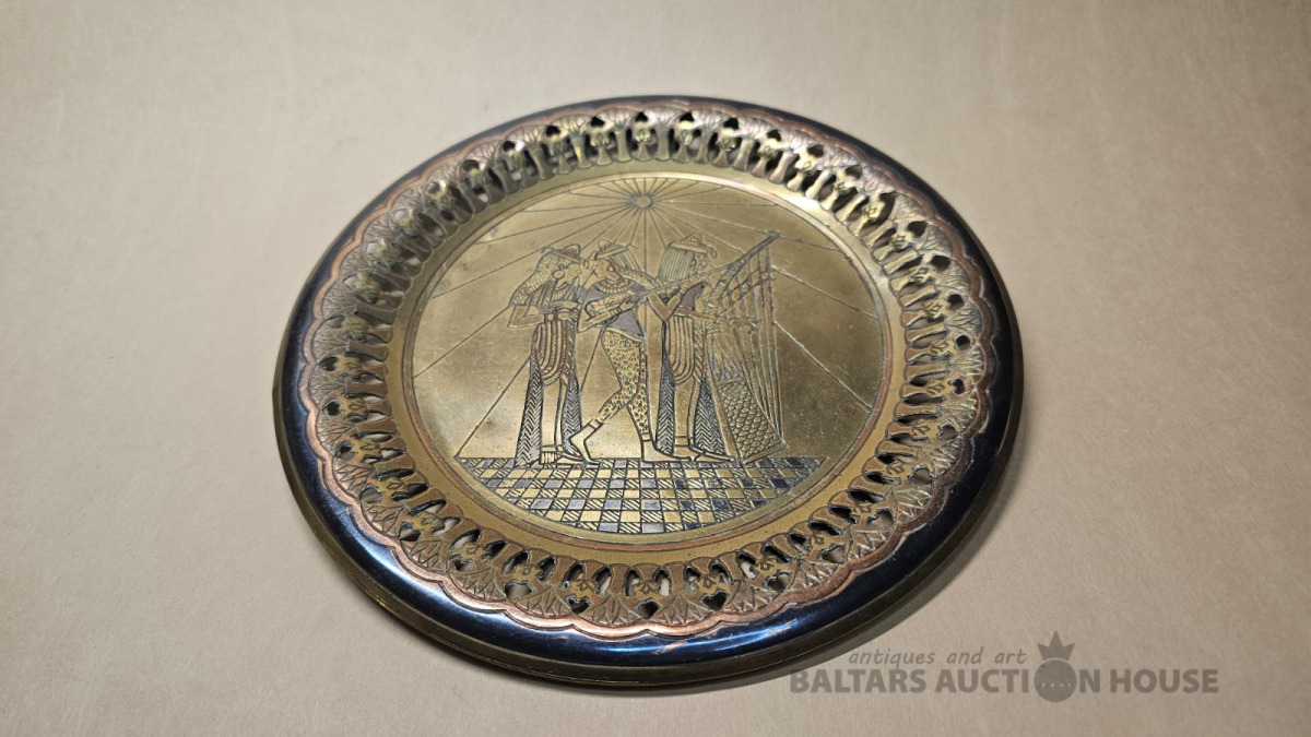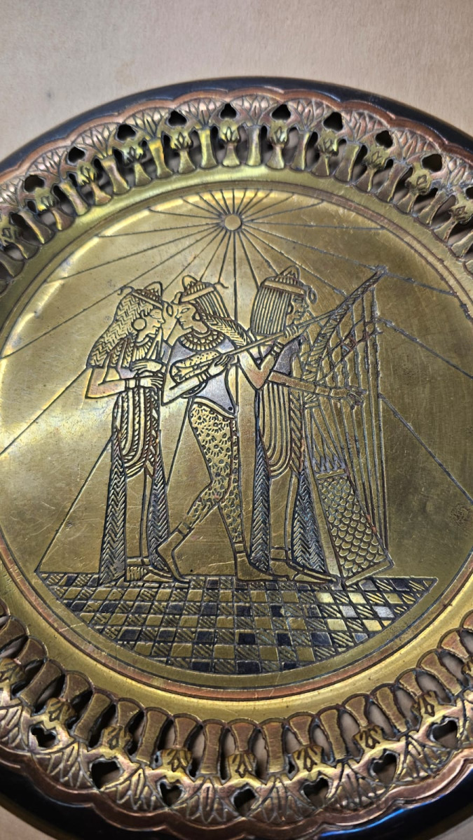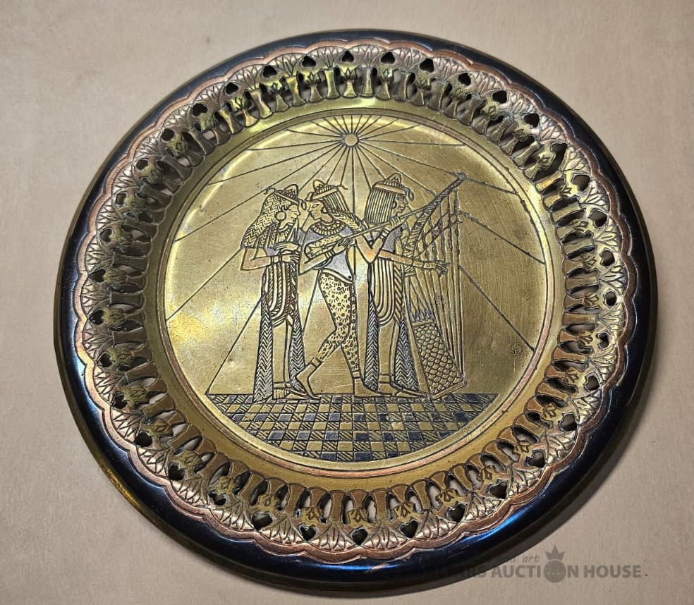 2 gab. Dekoratīvs šķīvis ar Ēģiptiešu vai Persiešu motīvu un Saldumu trauks? Metals.