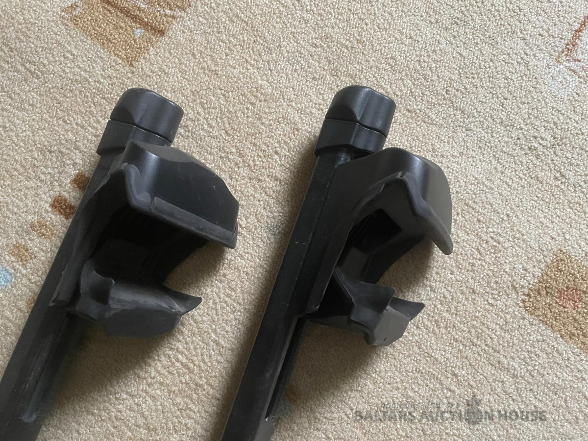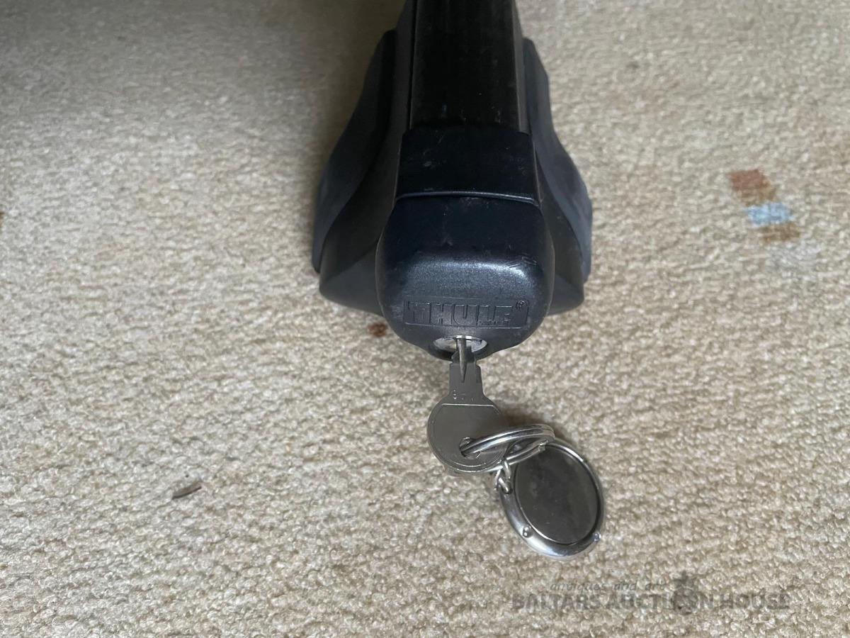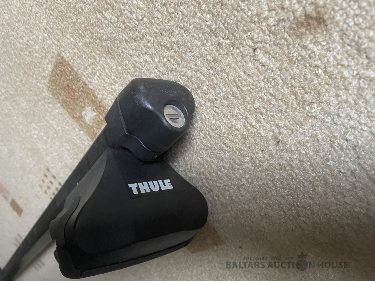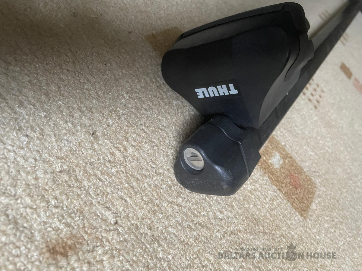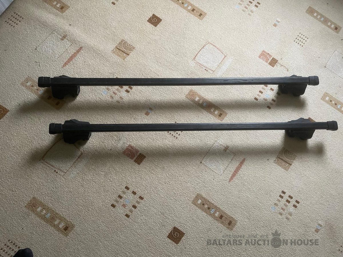 Thule jumta škērsstieņi Square Bar ar sakabēm (lietošanai gatavs komplekts). Stiprināms uz auto jumta sliedēm (piemēram: auto jumta sliedes kā Mazda 5). Ražoti Zviedrijā. Top kvalitāte, ilgmūžība un tehniskie parametri. Mazlietoti, teicamā tehniskā un labā vizuālā stāvoklī ar oriģinālo THULE atslēgu. Šķērsstieņu max garums 125 cm, attālums starp satvērējiem stiprināšanai pie jumta sliedēm ir regulējams. Stap jumta sliedēm šaurākajā vietā jābūt min 85 cm, max 100 cm. Satvērēju platums atvērtā veidā 5 cm. Stieņu augstums 10 cm. Lielāka kravnesība kā citiem ražotājiem (100 kg). Pašsvars ap 2 kg. Ļoti ērti un viegli uzliekami 5-10 min.