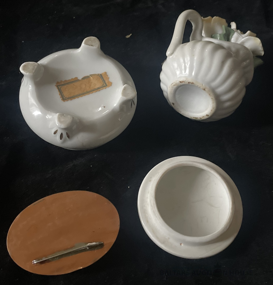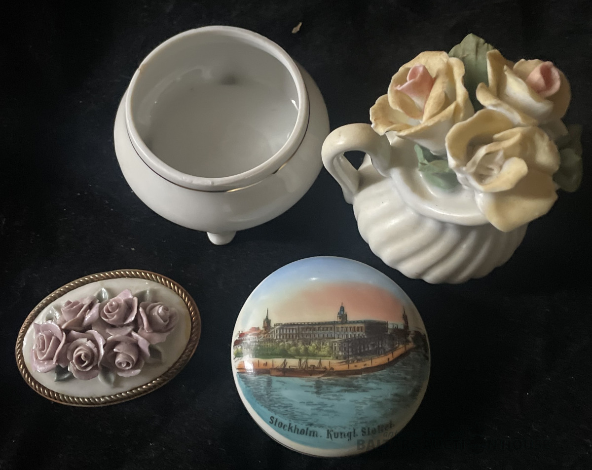 4 nelielii priekšmeti, porcelāns, keramika, metāla aizmugure brošai, lādītei augšmalā robs, priekšmeti NAV mazgāti !!!