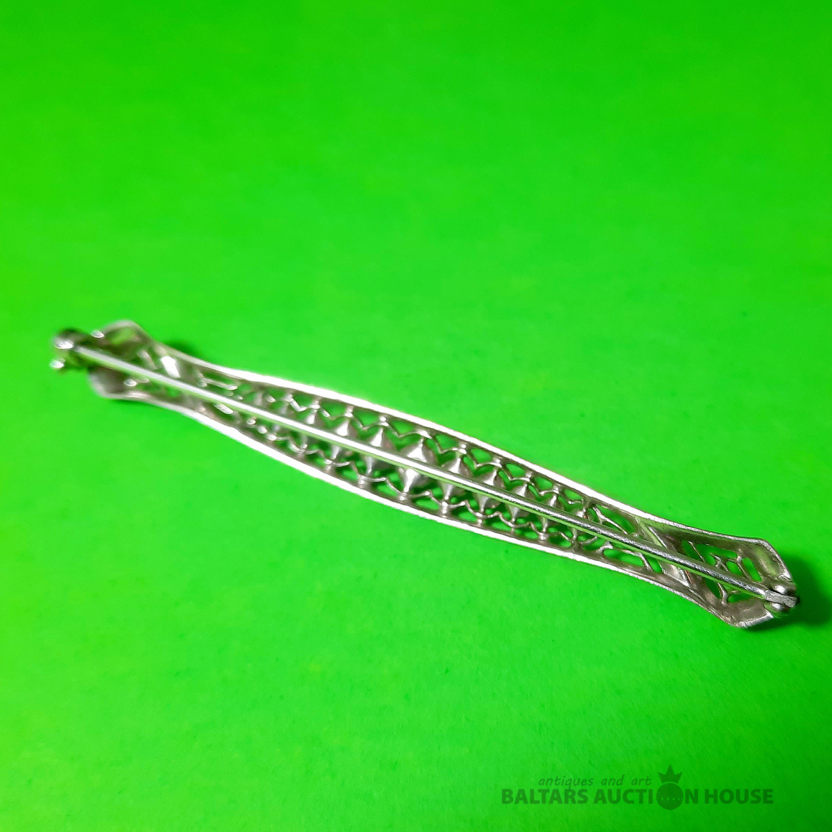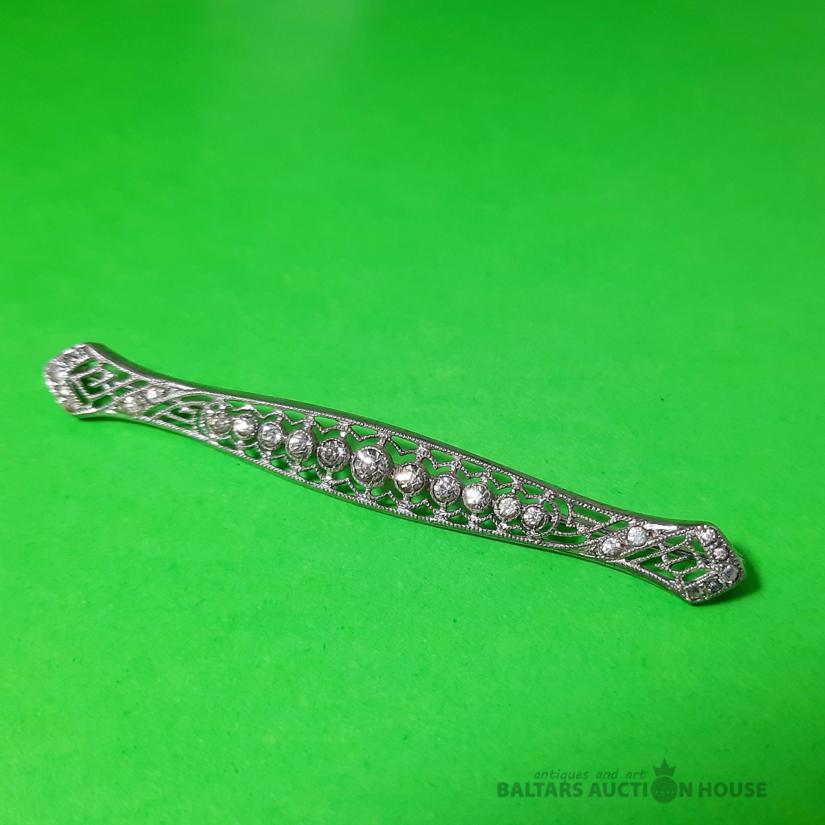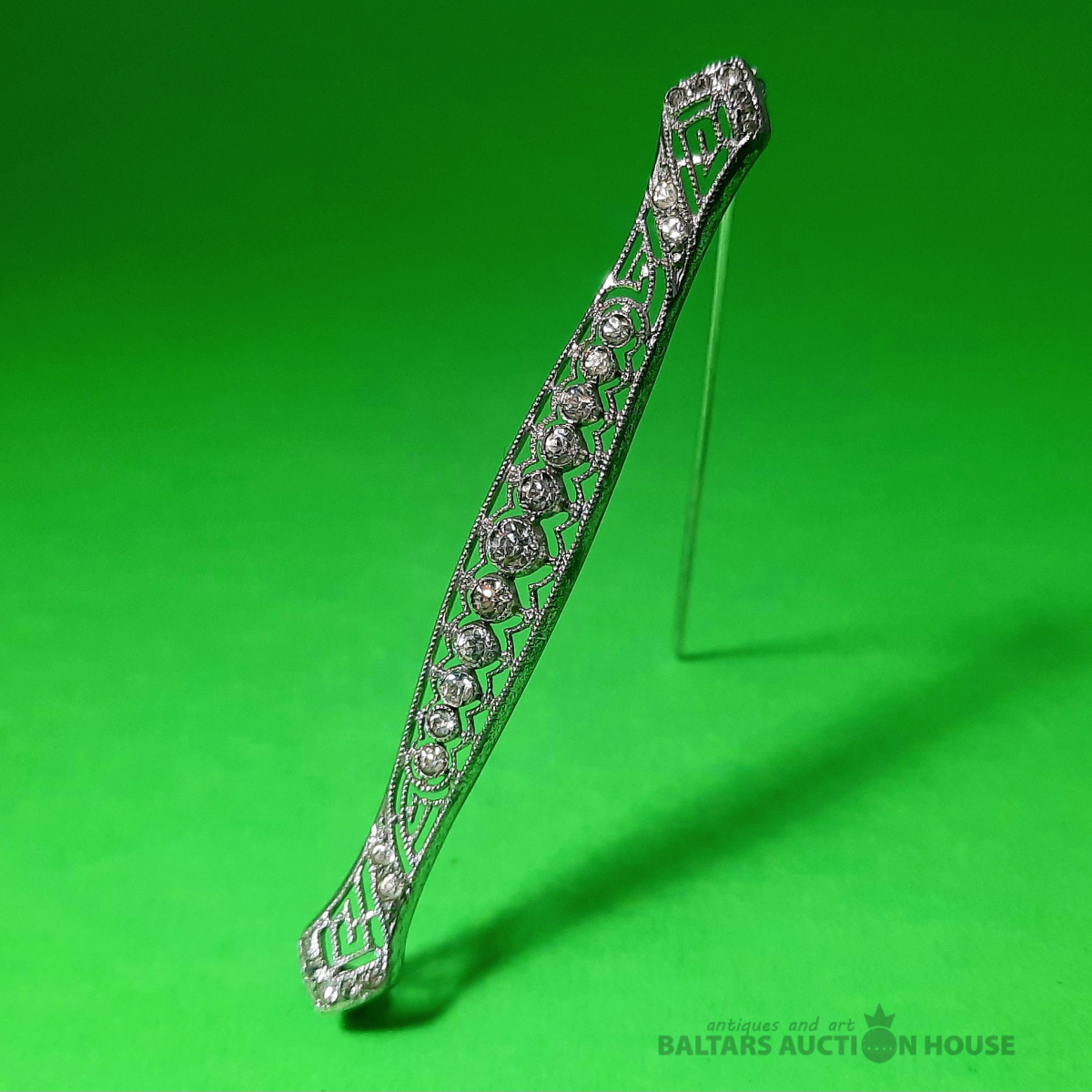 Art Deco stila piespraude ar baltiem akmeņiem. Sudrabs, 925. prove. Svars 5,55 grami. Augstums 7 cm.