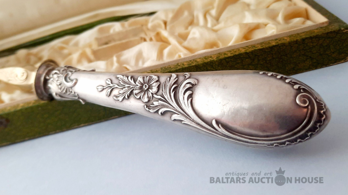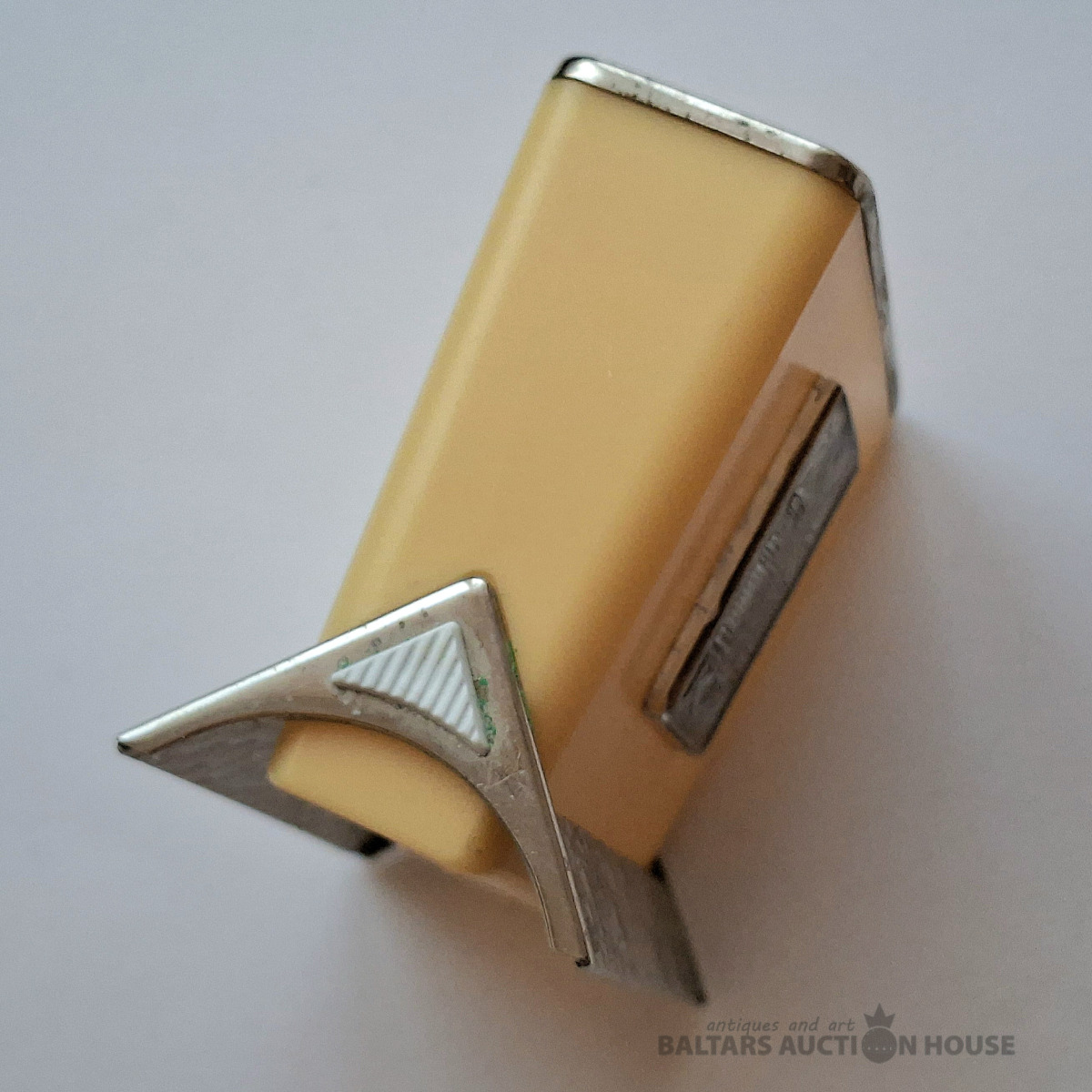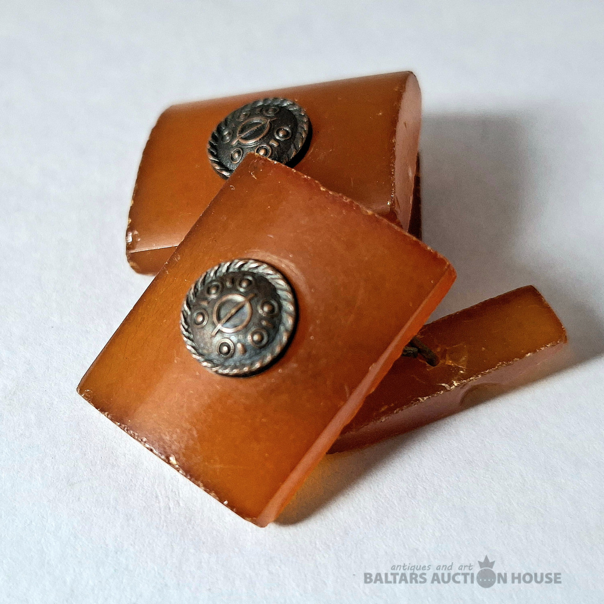 Art Deco stila piespraude ar baltiem akmeņiem. Sudrabs, 925. prove. Svars 5,55 grami. Augstums 7 cm.