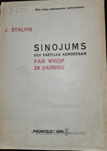 J.Staļins ." Siņojums XVIIPartijas kongresam par WK(I)P ZK Darbību."1934 "Prometeja "izdevums.