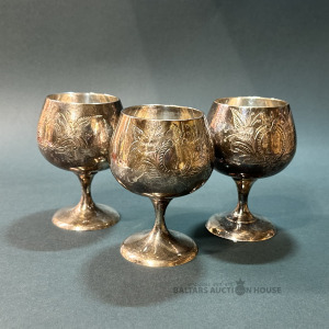 3 metāla GLĀZES, roku darbs, alpaks? sudrabots, biezs sudrabojums, izteikta patina, gravējums ar štiheli, augstums 100 mm, dzidra skaņa saskandinot, marķējums par sudrabojumu, 19/20.gds mija, patina saglabāta, bet viegli notīrāma pie nepieciešamības.