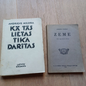 Andrievs Niedra — Kā tās lietas tika darītas, 1943. g. (vāku zīm. Vidbergs) + Andrievs Niedra — Zeme, 1929. g.