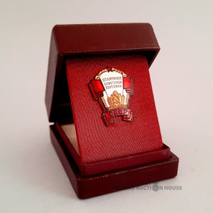PSRS. Nozīmīte "Izcila padomju tirdzniecība". Nr. 2928. Burti vārdā "PSRS" ir noapaļoti. Maskavas monētu kaltuve, 1960. gadi. Bronza, emalja. Monētu kaltuves zīme uz vītnes "Mint". Oriģinālajā korpusā.