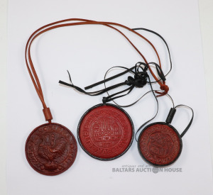 Zīmogi 3 gab. d=6,4 cm, 7,4 cm un 8 cm. Ē. Priedkalns, āda, roku darbs.