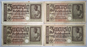 4 Trešā reiha 20 marku banknotes, 1940.–1945. gads. Stāvoklis atbilst fotogrāfijai.