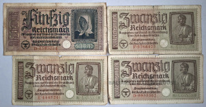 4 Trešā reiha 50,20 marku banknotes, 1940.–1945. gads. Stāvoklis atbilst fotogrāfijai.