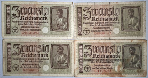 4 Trešā reiha 20 marku banknotes, 1940.–1945. gads. Stāvoklis atbilst fotogrāfijai.