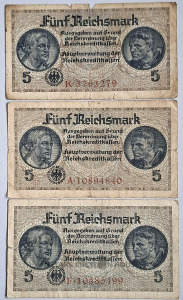 3 Trešā reiha 5 marku banknotes, 1940.–1945. gads. Stāvoklis atbilst fotogrāfijai.