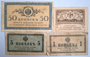 20 rubļu, 50, 5 un 1 kapeiku banknotes. Krievijas impērija. Stāvoklis redzams fotoattēlā.