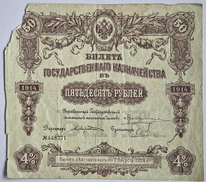 Valsts kases banknote, 50 rubļi, 1914. gads. Stāvoklis redzams fotoattēlā.
